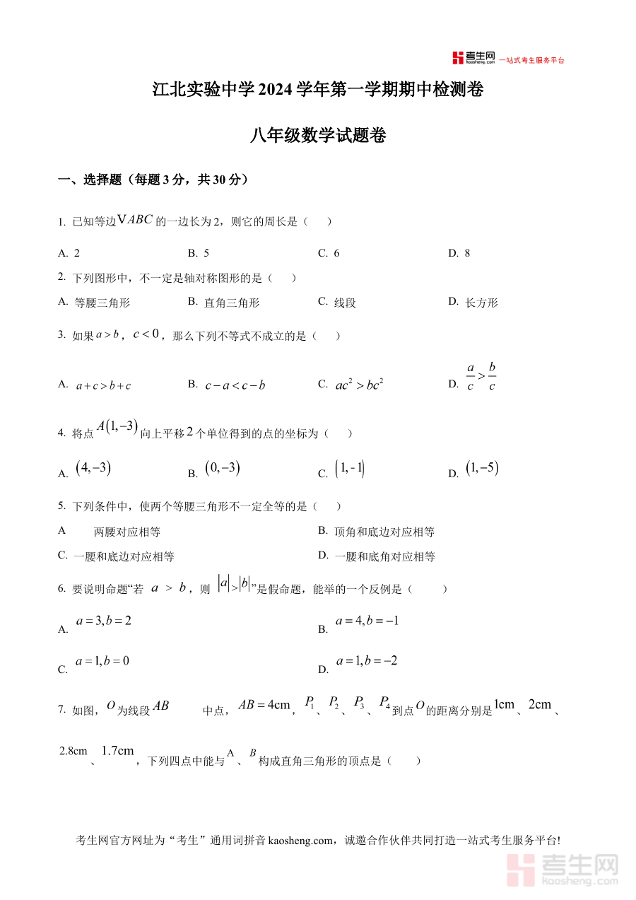 《精品解析:浙江省宁波市江北实验中学2024-2025学年八年级上学期期中考试数学试题(原卷版)》是针对浙江省宁波市江北实验中学2024至2025学年八年级上学期期中考试的数学学科备考资料,包含该阶段期中考试的原卷内容,为学生和教师提供贴合本地校考实际的参考素材。