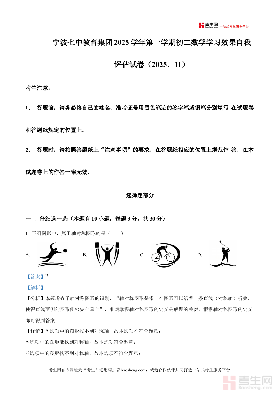 《精品解析:浙江省宁波市第七中学2025-2026学年上学期 八年级期中数学卷(解析版)》是针对浙江省宁波市第七中学2025至2026学年上学期八年级期中数学考试的配套备考资料,聚焦该阶段数学学科的期中检测场景,为相关使用者提供具有针对性的解析支持。