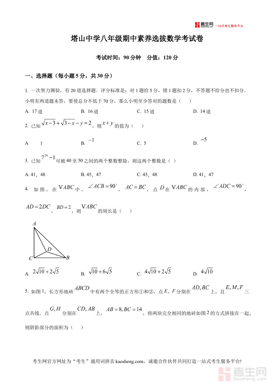 本资料适用于浙江省宁波市象山县塔山中学八年级学生及相关数学教师群体,对学生而言,能帮助其提前熟悉期中素养选拔考试的形式,为高效备考提供有力支撑;对教师而言,可借助该资料优化教学策略与备考指导方案,增强教学与备考的针对性和实效性。