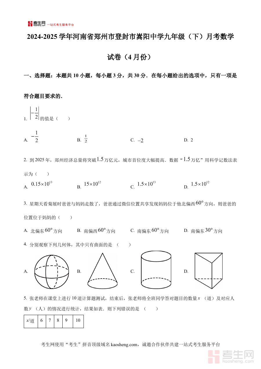 本资料适用于嵩阳中学九年级学生、数学教师及关注该阶段数学学习的相关人员,其价值在于通过真实的月考原卷形式,助力学生熟悉考试流程与题型结构,巩固知识体系;对教师而言,则能帮助精准把握教学重点与学生掌握程度,优化教学策略以提升教学质量。