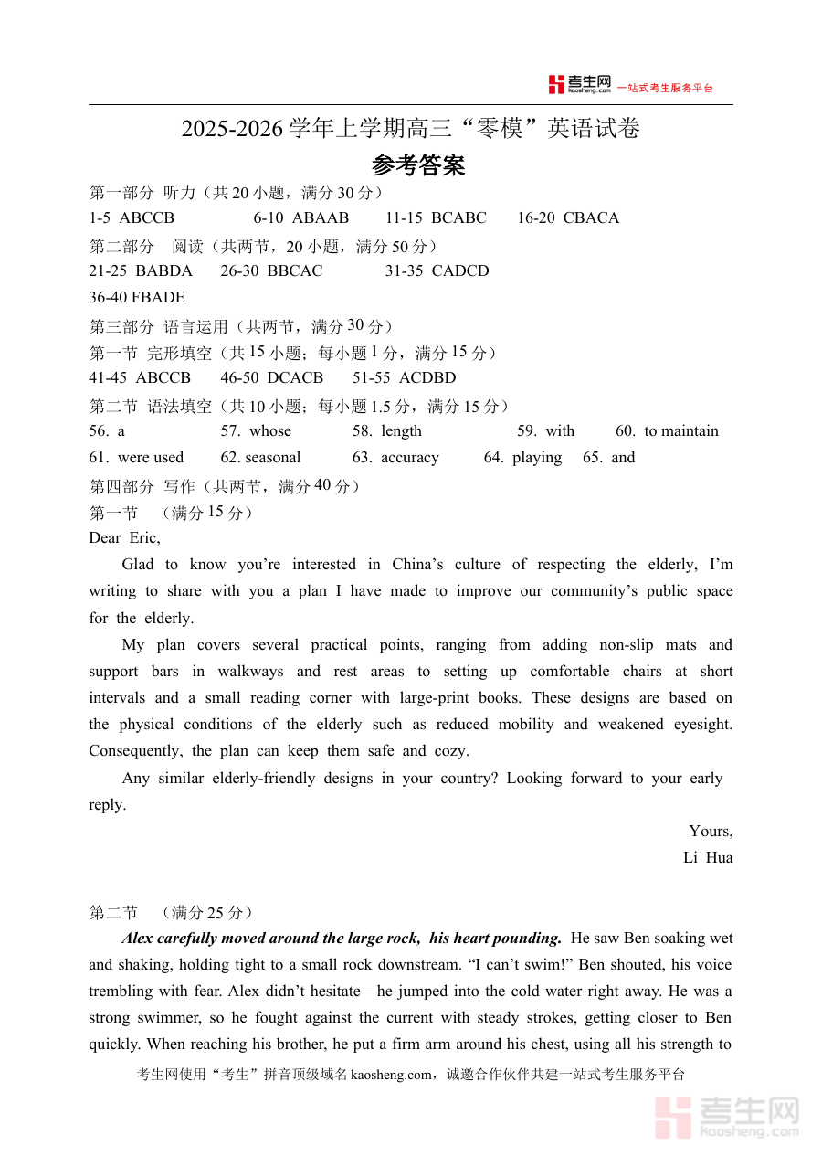 《2025-2026学年第一学期高三“零模”英语参考答案》是针对2025至2026学年第一学期高三年级“零模”英语考试的配套参考资料,零模考试作为高三阶段初期衔接高中前两年学习与高考备考的关键检测环节,旨在帮助师生全面把握学生当前的英语学习基础与综合应用能力水平,而该参考答案则为这一检测提供了标准化、规范化的结果参照,确保考试评价过程的客观性与准确性。