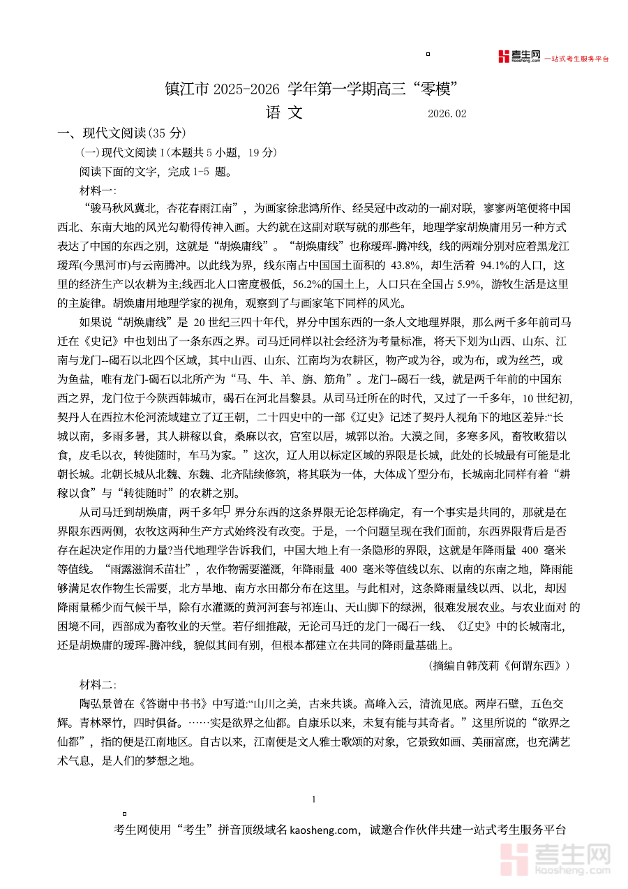 该试卷主要适用于江苏省镇江市2025至2026学年的高中语文学习者,尤其是处于备考关键阶段的学生群体。对于教师而言,它可作为学情分析工具辅助制定贴合学生实际的教学计划;对于学生来说,是自我检测与查漏补缺的重要资源。合理利用这份试卷能帮助使用者明确备考方向、优化复习路径,为后续学习与考试奠定坚实基础,提升应对正式考试的信心与能力。