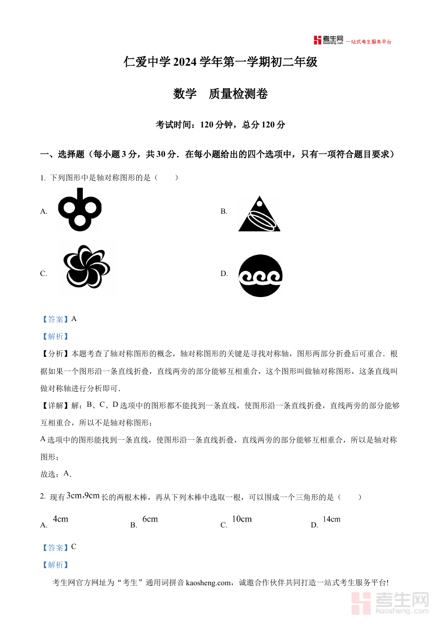 《精品解析:浙江省宁波市镇海区仁爱中学2024-2025学年八年级上学期数学期中试卷(解析版)》是针对浙江省宁波市镇海区仁爱中学2024至2025学年八年级上学期数学期中考试的专项备考资料,聚焦该阶段数学学科的期中检测场景,依托该校具体的期中试卷资源,为使用者提供具有针对性的解析内容。