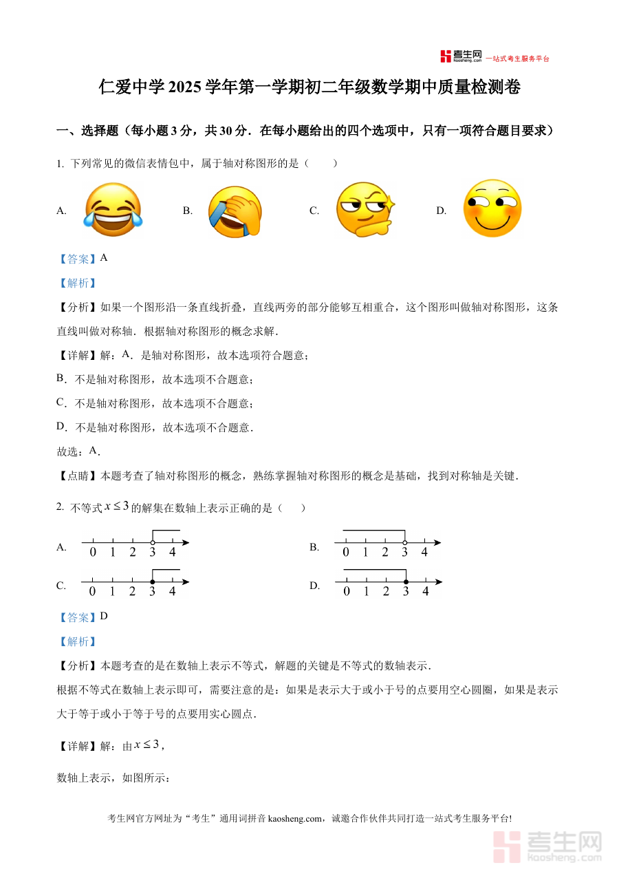本资料主要适用于浙江省宁波市镇海区仁爱中学八年级学生,同时也可为镇海区内其他同类学校的八年级学生提供参考,其解析内容能够帮助学生深入理解期中检测的考查要求与答题思路,强化阶段知识巩固,提升期中备考效率与质量,为后续数学学习奠定坚实基础。
