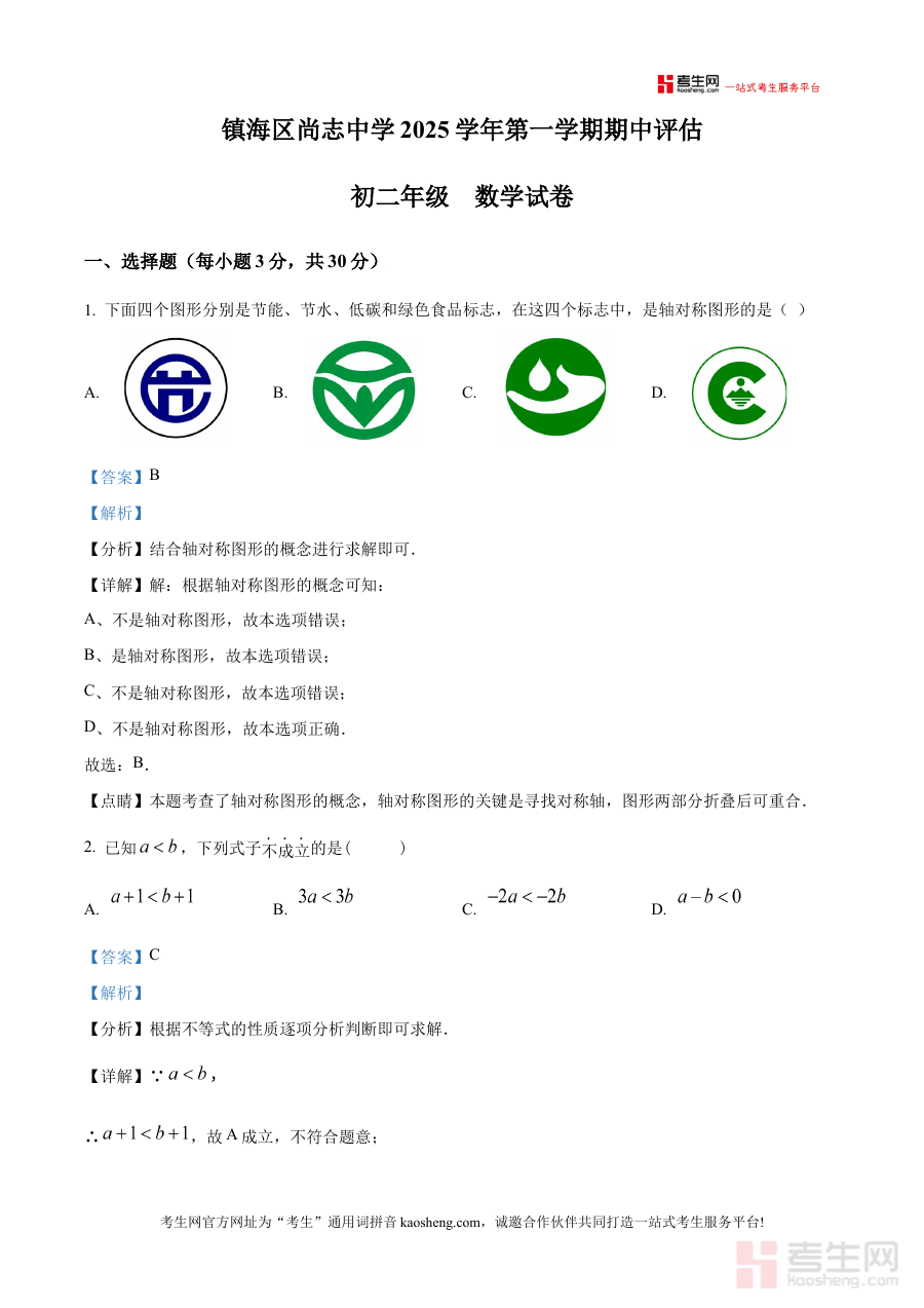 本资料适用于浙江省宁波市镇海区尚志中学2025-2026学年八年级学生,以及需要指导该阶段学生数学学习的教师和家长群体,其解析内容有助于使用者进行有效的阶段检测反馈,优化备考策略,提升对期中数学考试的综合应对能力。