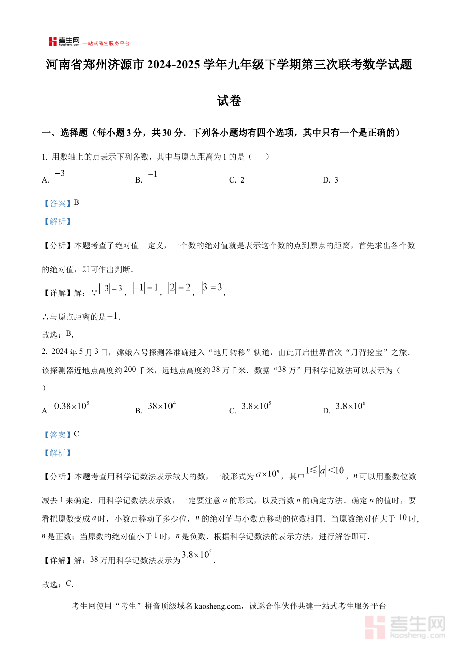 《精品解析:河南省郑州济源市2024-2025学年九年级下学期第三次联考数学试题试卷(解析版)》是针对河南省郑州济源市区域内2024-2025学年九年级下学期第三次联考数学科目的专项备考资料。该资料依托当地联考的命题方向与区域教学实际,为使用者提供了贴合本次考试要求的数学试题及配套解析内容,能够有效反映该阶段数学学科的考查重点与学生应具备的能力水平,是九年级师生应对本次联考的重要参考材料。