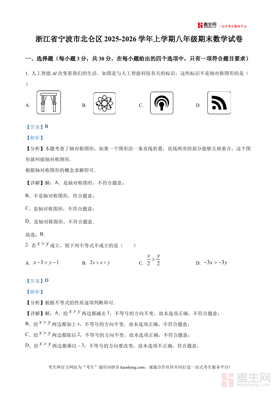 《精品解析:浙江宁波市北仑区2025-2026学年上学期八年级期末数学试卷(解析版)》是针对浙江宁波市北仑区2025至2026学年上学期八年级期末数学考试设计的备考资料,精准贴合该地区该学段该学期的期末数学测评场景,为使用者提供与考试实际要求相匹配的参考依据。