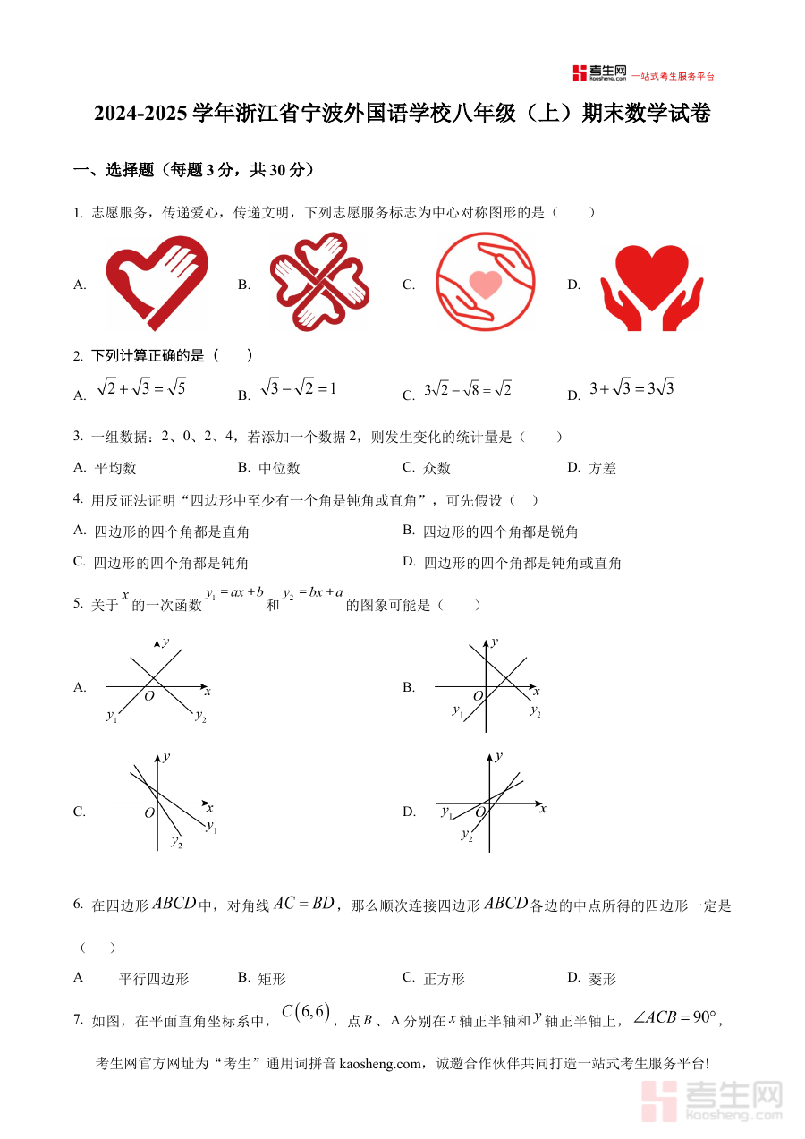 《精品解析:浙江省宁波外国语学校2024-2025学年八年级上学期期末考试数学试卷(原卷版)》是针对浙江省宁波外国语学校2024-2025学年八年级上学期期末数学考试的备考资料,包含该考试对应的原卷内容,为使用者提供与实际考试形式一致的练习与参考载体。
