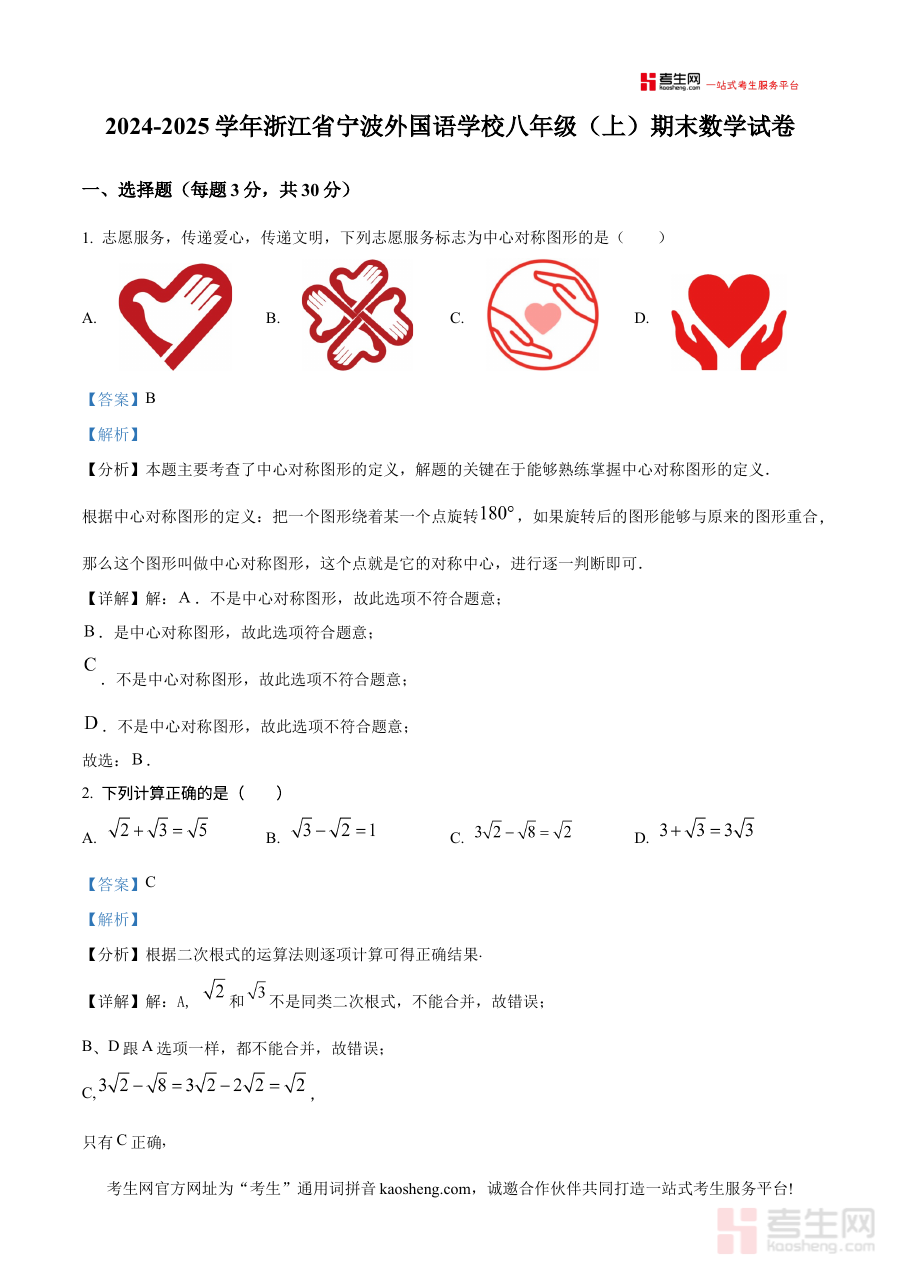 其适用人群主要为浙江省宁波外国语学校八年级的学生、数学学科教师以及需要准备该期末考试的学习者。学生通过解析内容可深化对知识点的理解与解题方法的掌握;教师可借助该资料优化教学策略与辅导重点,提升教学针对性;整体而言,该资料在阶段检测与备考规划方面具有显著价值,能有效提升学习与教学的效率和质量。