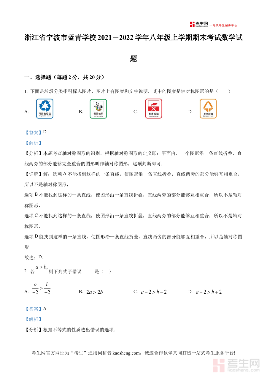 《精品解析:浙江省宁波市蓝青学校2021—2022学年八年级上学期期末考试数学试题(解析版)》是针对浙江省宁波市蓝青学校2021至2022学年八年级上学期数学期末考试设计的备考资料,聚焦该特定时段、地区及学校的八年级数学期末检测需求,为相关使用者提供专业的试题解析支持。
