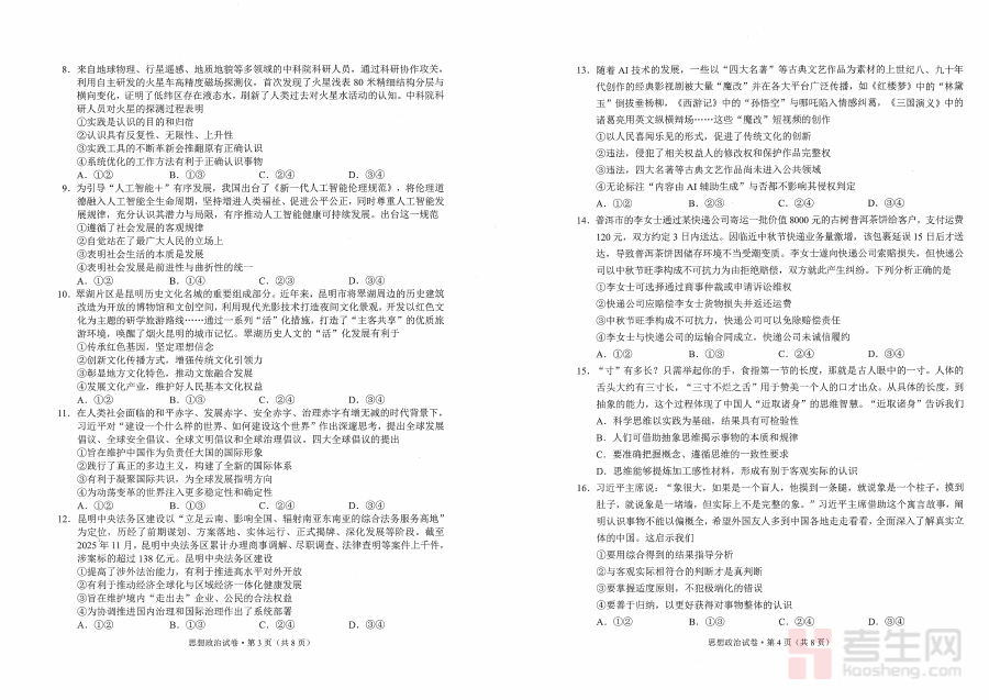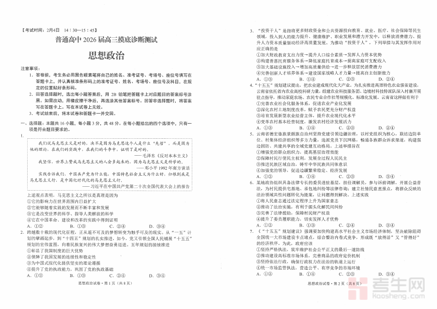 《政治试卷(G3)+昆明市市统考2026届》是昆明市教育系统针对2026届G3年级学生组织的市级统一考试政治学科配套备考资料,紧密贴合本地教育教学标准与市统考命题趋势,整合了区域考试的核心考查方向与阶段学习要求,为师生提供了与昆明本地考试体系高度匹配的参考资源,助力使用者快速对接市统考的考查逻辑与内容框架。