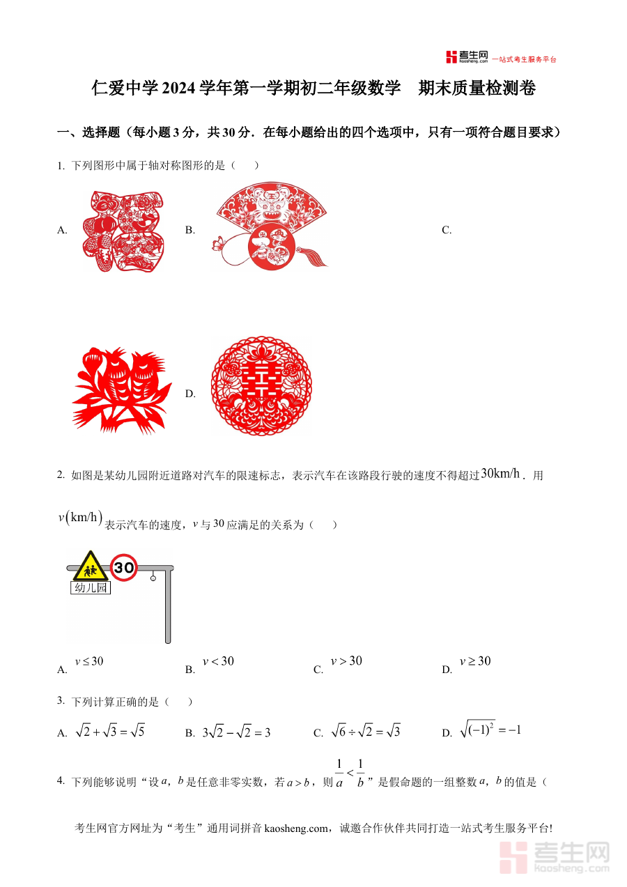 此资料适用于浙江省宁波市镇海区仁爱中学八年级学生、数学教师及相关家长群体。对于学生而言,可通过模拟真实考试场景提升应试能力与时间管理技巧;对于教师而言,能辅助了解期末考命题方向与试卷布局,优化后续教学计划;对于家长而言,可借助资料把握孩子学习阶段的重点与考试要求,更高效地配合学校开展学习支持工作。