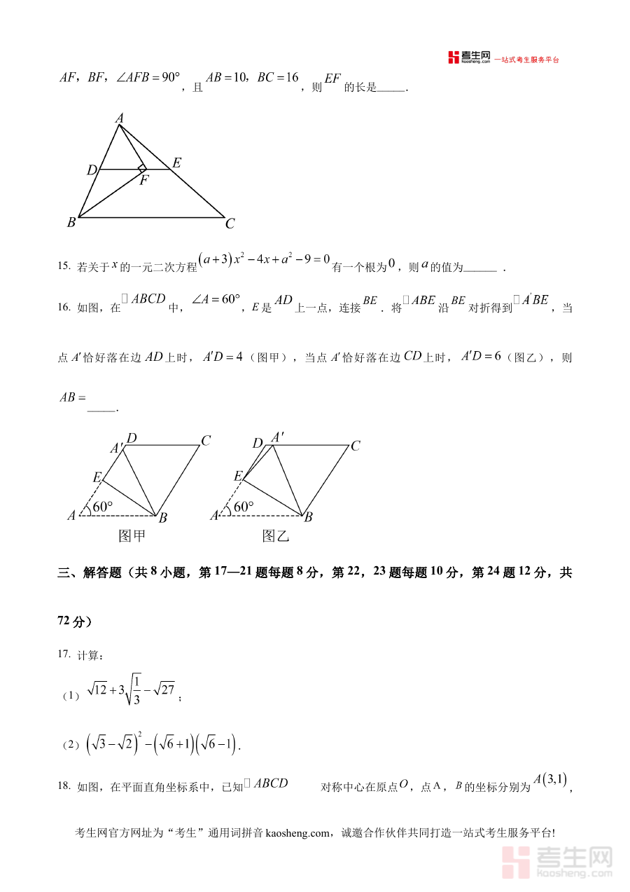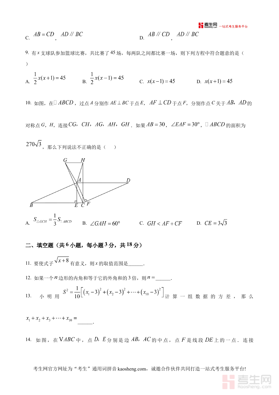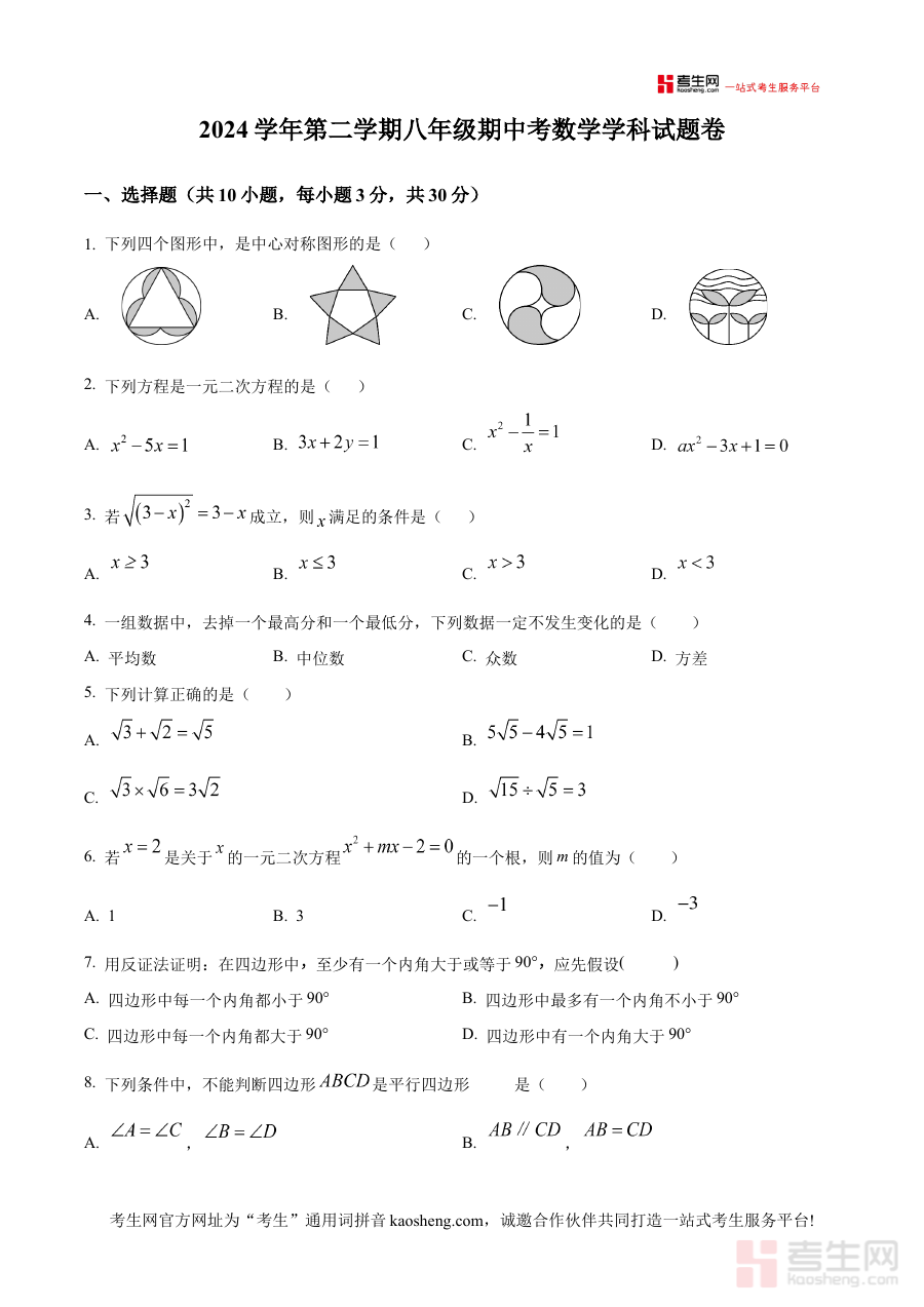 《精品解析:浙江省宁波市余姚市城区初中 2024-2025学年八年级下学期4月期中数学试题(原卷版)》是针对浙江省宁波市余姚市城区初中2024-2025学年八年级下学期4月期中考试设计的数学学科原卷备考资料,精准对应该地区该学段的阶段性考试需求,为相关使用者提供与实际考试形式一致的练习载体。