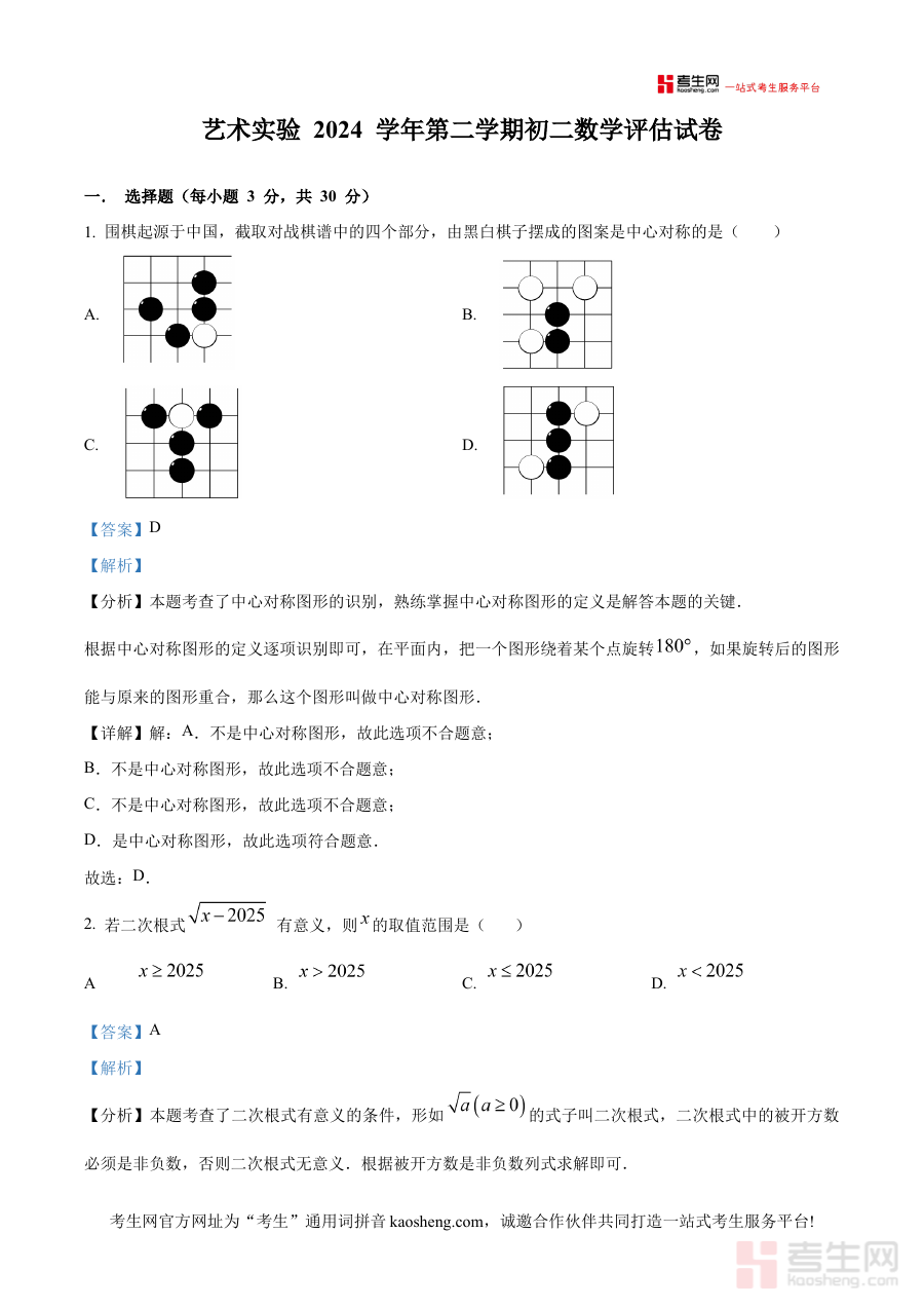 《精品解析:浙江省宁波市宁波艺术实验学校2024-2025学年下学期八年级数学评估试卷(4月)(解析版)》是针对浙江省宁波市宁波艺术实验学校在2024-2025学年下学期4月份开展的八年级数学评估考试所编制的配套解析资料。该资料紧密贴合学校当学期的教学进度与阶段性评估需求,为学生和教师提供了与本次评估考试直接相关的专业参考内容,是辅助应对此次数学阶段性评估的重要备考资源。