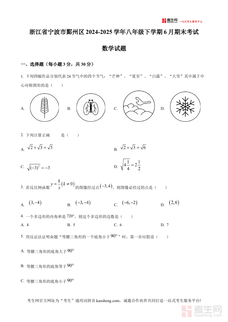 《精品解析:浙江省宁波市鄞州区2024-2025学年八年级下学期6月期末考试数学试题(原卷版)》是针对浙江省宁波市鄞州区2024-2025学年八年级下学期6月期末考试的数学学科备考资料,聚焦该地区该学年八年级下学期期末阶段的数学考试需求,为考生提供与本地期末考直接关联的原卷类资源。