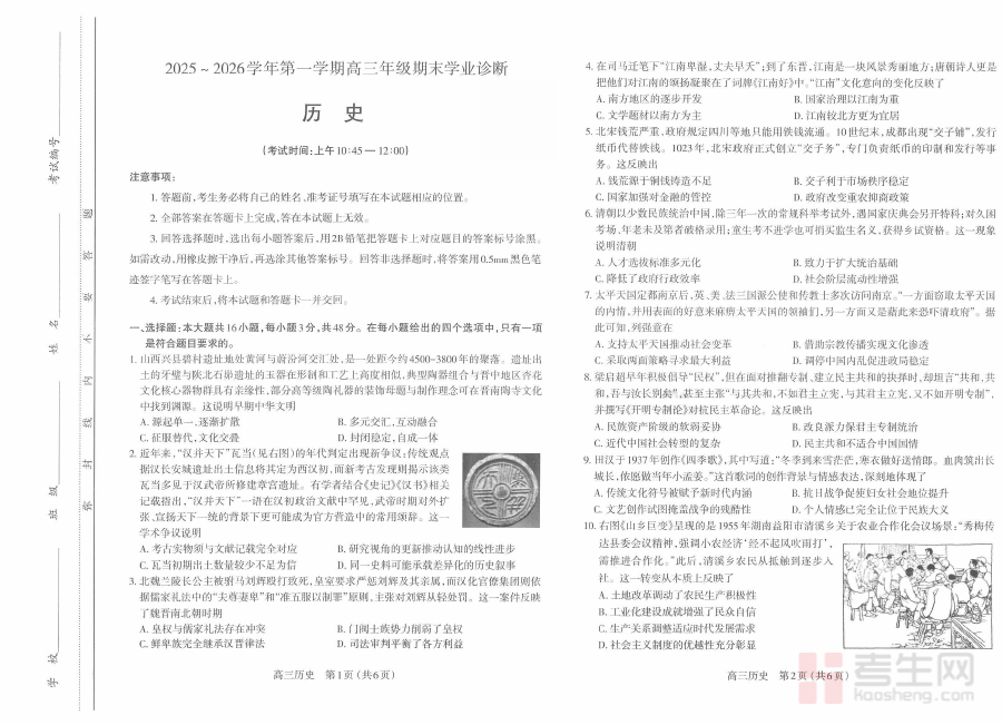 对于太原市25-26学年高三年级学生而言,该试卷是自我学习效果检测的有效载体,通过完成试卷可直观了解自身历史学科优势与不足,针对性调整学习计划;对于历史教师,试卷结果可优化教学方案和辅导策略;对于教育工作者,试卷能为区域历史教学质量评估提供参考,推动高三历史教学精准化和高效化。