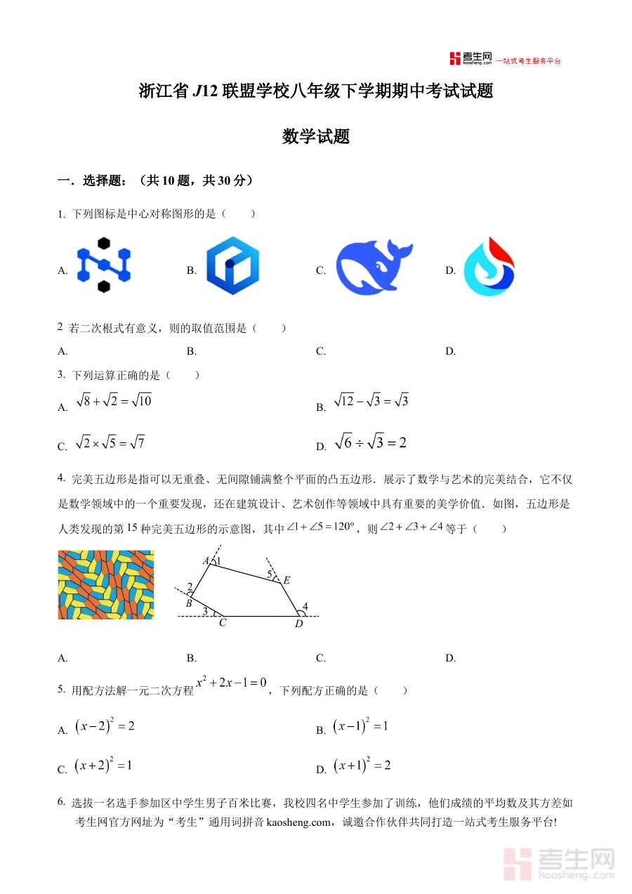 《精品解析:浙江省J12共同体联盟学校2024-2025学年八年级下学期4月期中数学试题(原卷版)》是针对浙江省J12共同体联盟学校在2024-2025学年八年级下学期4月开展的期中数学考试所编制的备考资料,包含该次考试的原卷内容,能够为相关学习者提供贴合区域联盟考试标准的练习载体。