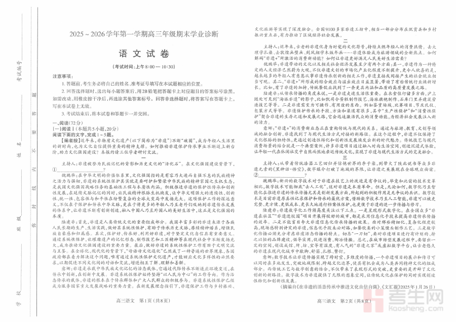 该试卷作为高三第一学期期末的核心测评资料,可有效助力教师与学生精准诊断当前阶段语文学习的实际状况,清晰识别知识掌握的薄弱模块,为后续的高考备考规划提供科学的数据支撑,同时也能模拟期末考的真实场景,让学生熟悉考试流程、时间分配与题型布局逻辑。