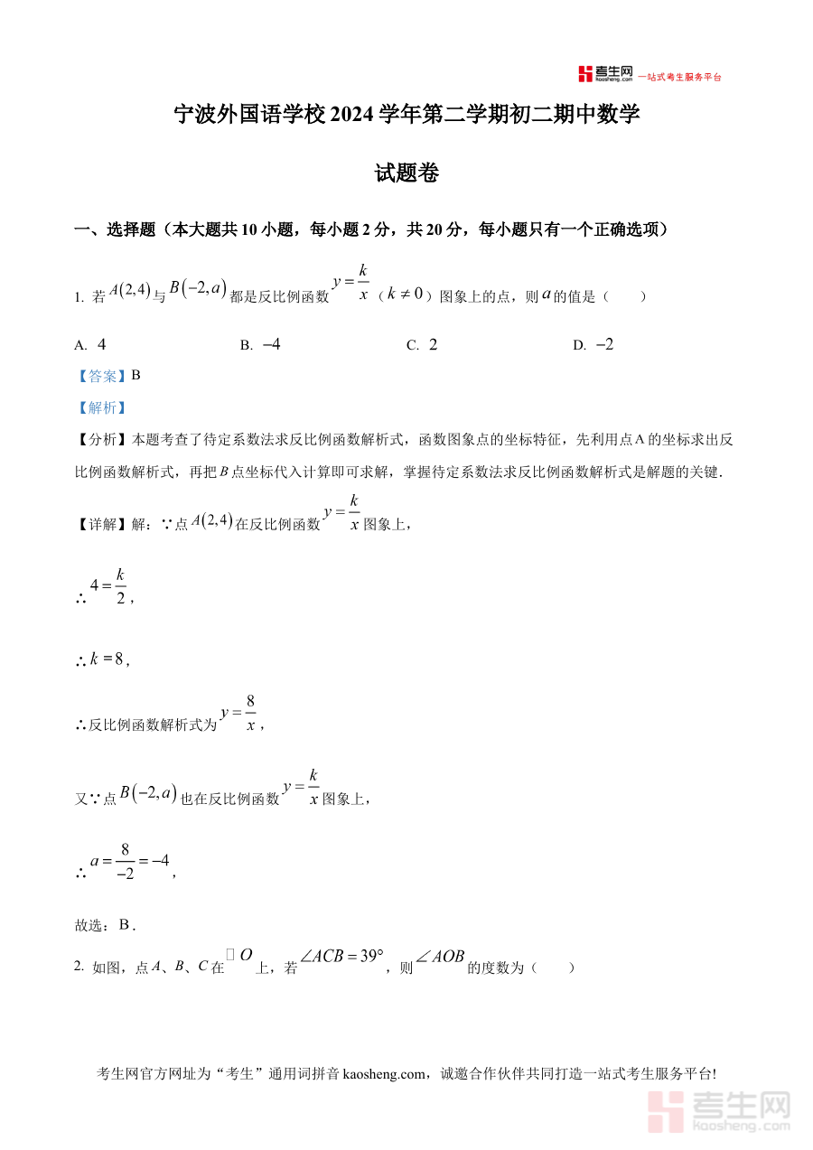 本资料适用于浙江省宁波市外国语学校2024-2025学年下学期的八年级学生及该年级数学教师群体,其解析内容能够助力学生提升备考效率,帮助教师优化教学策略,充分发挥阶段检测在教学与学习过程中的导向价值。