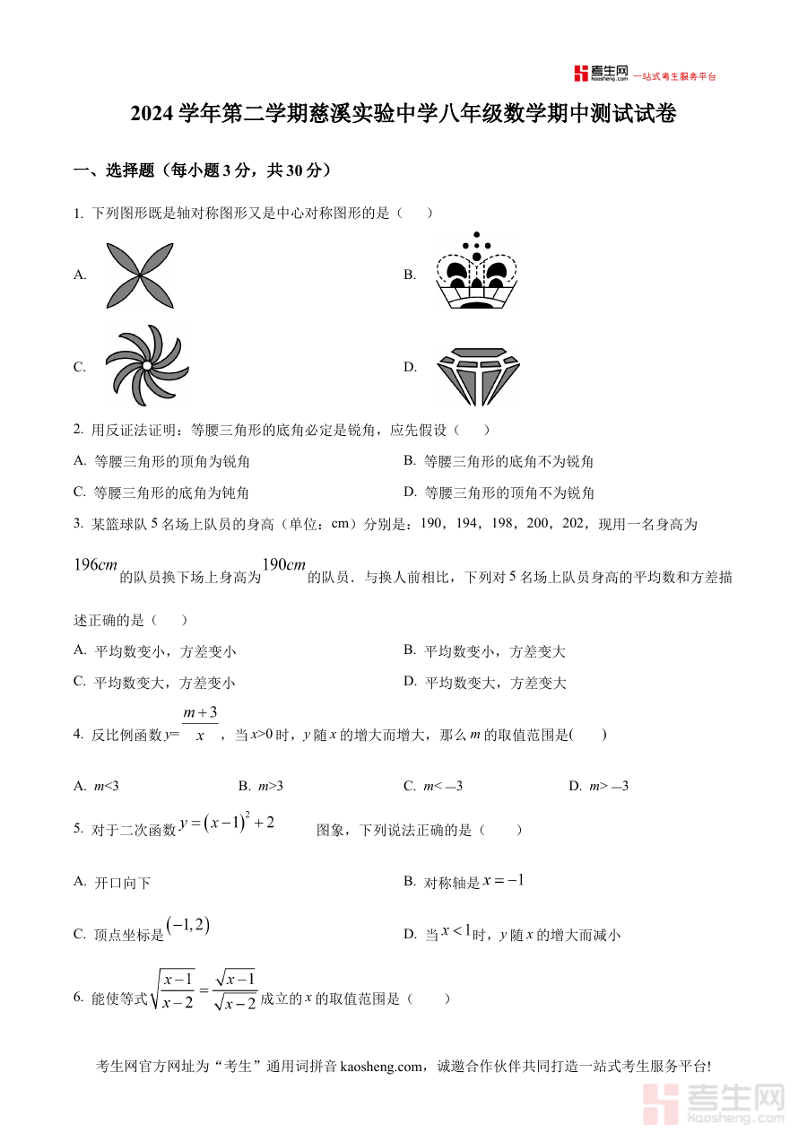 《精品解析:浙江省宁波市慈溪市慈溪实验中学2024—2025学年八年级下学期期中数学试卷(原卷版)》是针对浙江省宁波市慈溪市慈溪实验中学在2024至2025学年第二学期面向八年级学生组织的期中数学考试所提供的原卷形式备考资料。该资料精准对应学校该学期期中考试的数学学科内容,能够完整呈现此次考试的原始试卷样貌,为使用者提供与实际考试完全一致的试卷呈现形式和结构框架。