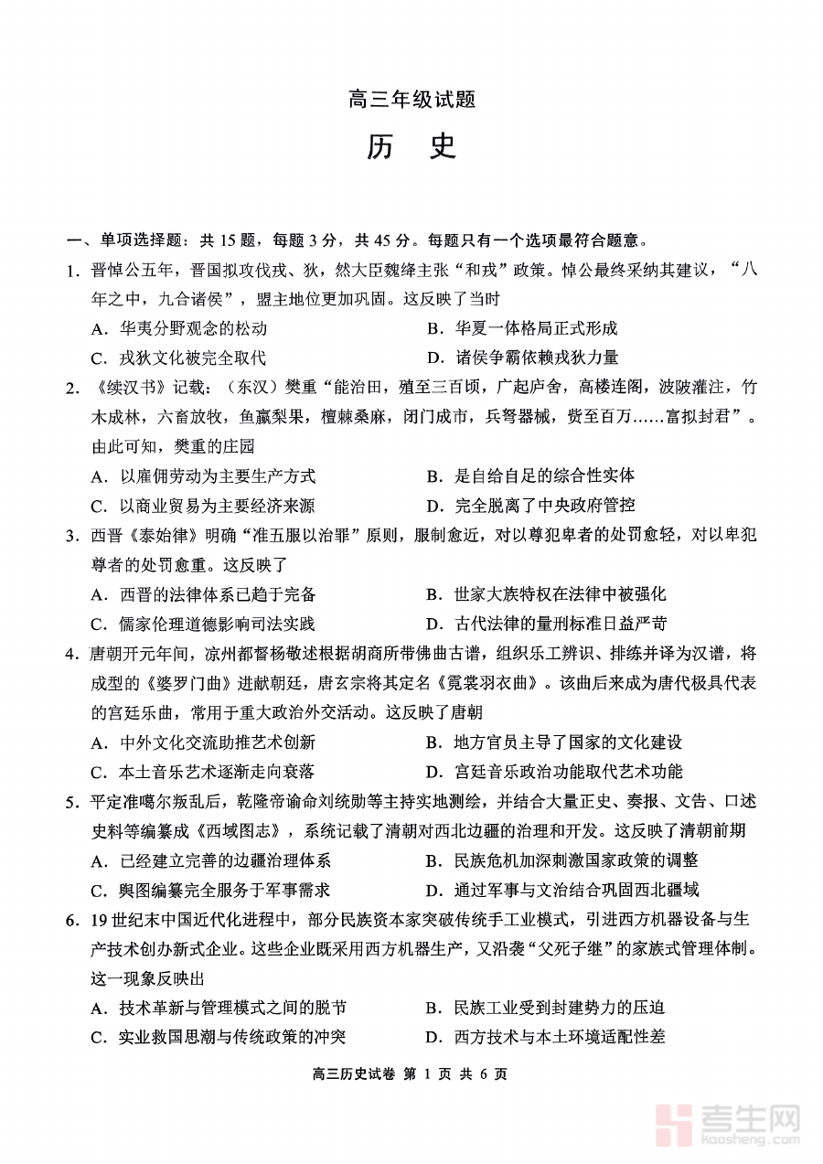 《江苏省无锡市2025-2026学年高三上学期期末考试历史试题(含答案)》是针对江苏省无锡市2025至2026学年高三年级上学期期末考试的历史学科备考资料。该资料对应特定学年与学期的区域期末检测,聚焦高三阶段历史学科的综合考查需求。