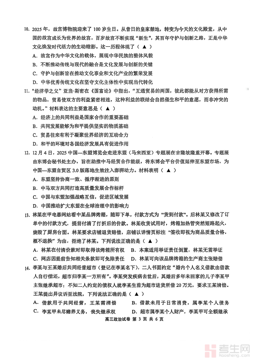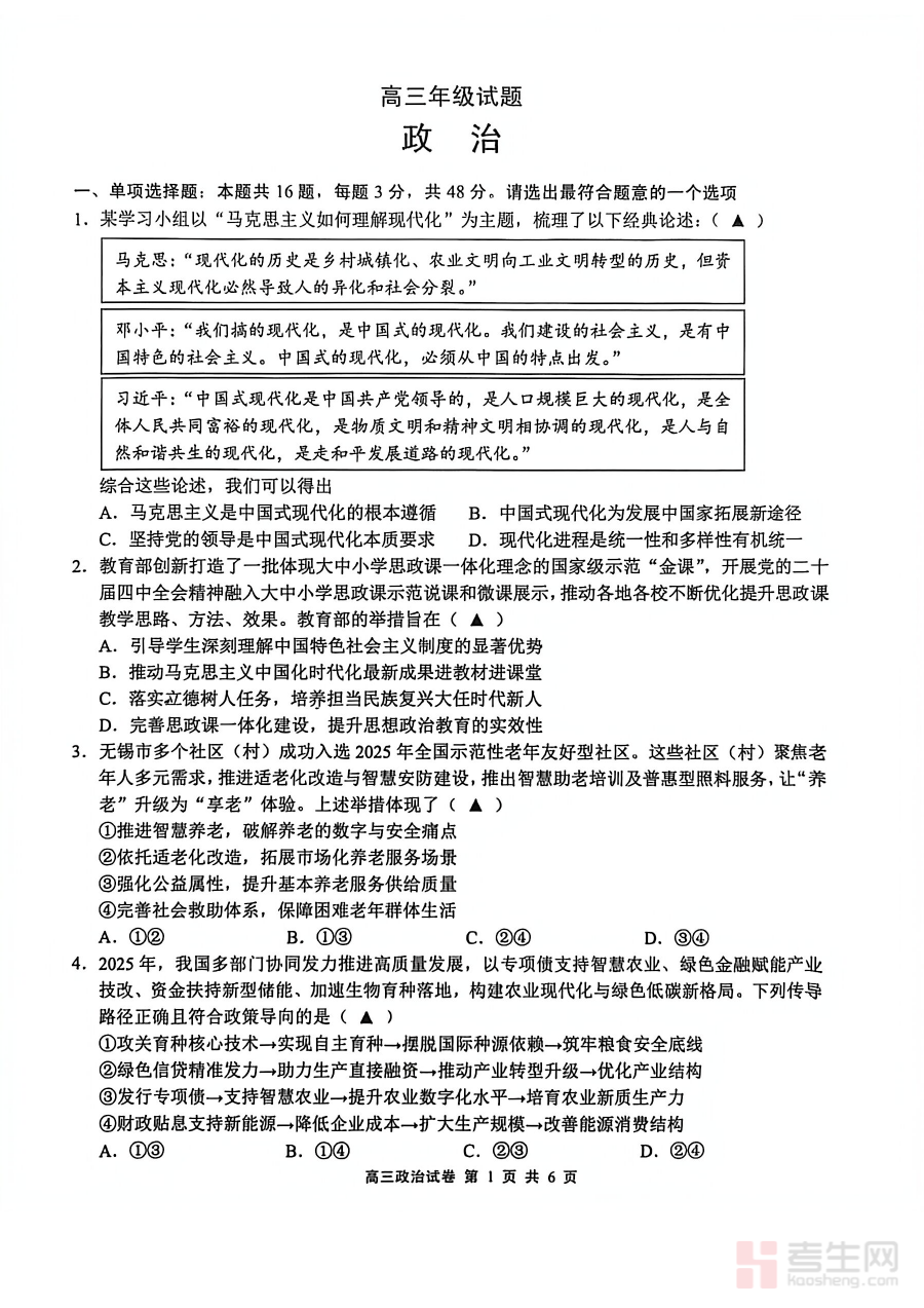 该资料主要适用于江苏省无锡市2025-2026学年的高三学生、政治学科教师及相关教育教研人员,其价值在于通过期末标准化检测形式,帮助学生熟悉区域期末考试的命题思路与考查重点,增强备考针对性;对教师而言,则可借助这份资料优化复习方案,推动高三政治学科教学与复习的高效开展。
