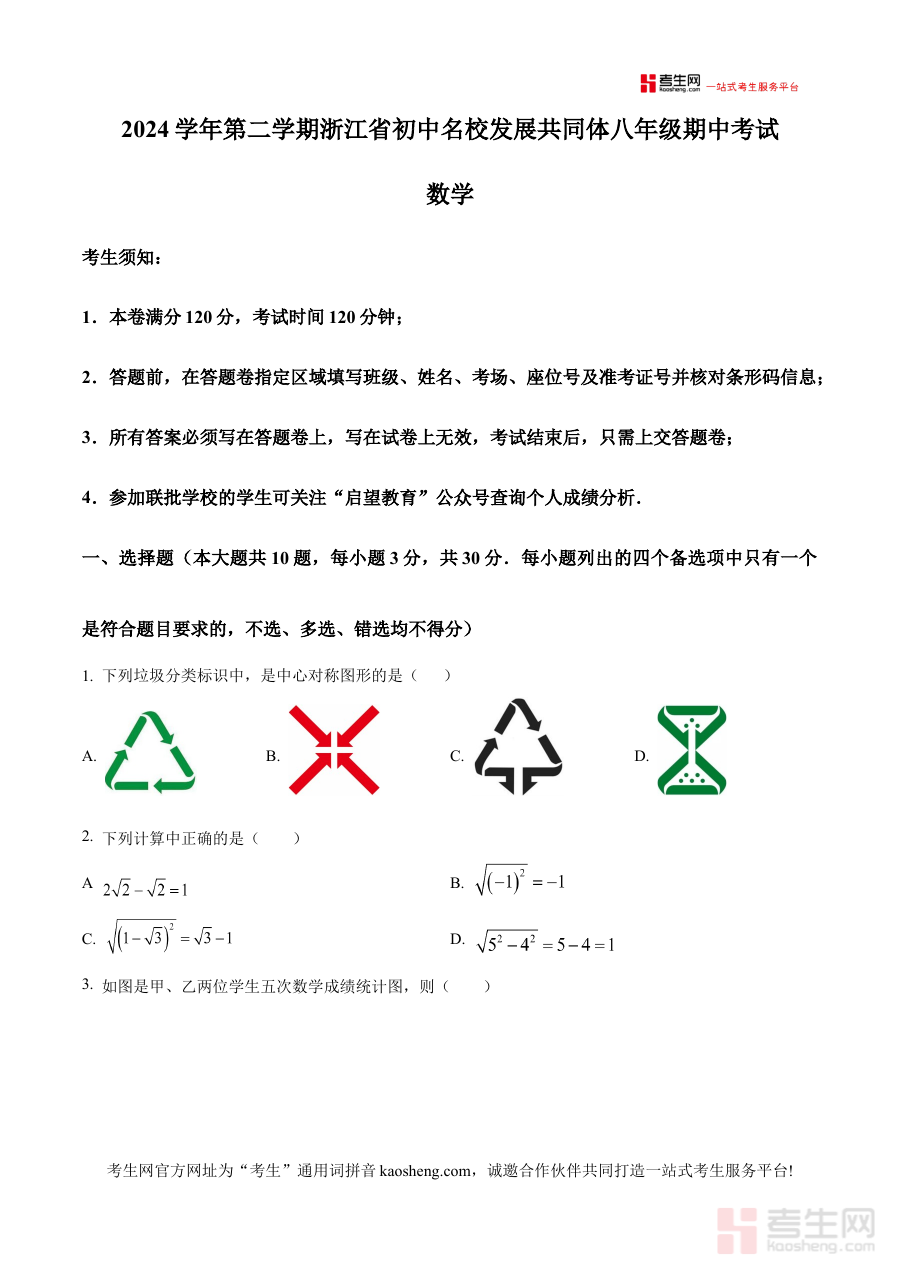本资料适用于浙江省初中名校发展共同体范围内的八年级学生、数学教师及学生家长。对学生而言,使用该原卷版试题可提前熟悉期中考试的题型结构与考试节奏,提升应试准备的针对性;对教师来说,可借助该资料开展阶段性教学效果检测与分析;对家长则能通过资料内容了解考试要求,更好地支持孩子的数学学习与备考规划,共同促进学生在数学学科上的阶段性提升。