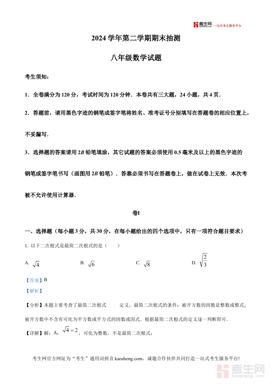 《精品解析:浙江省宁波市奉化区2024-2025学年八年级下学期期末数学试题(解析版)》是针对浙江省宁波市奉化区特定学年学期的数学期末考试所编制的备考资料,涵盖了该地区八年级下学期期末数学考试的试题内容及对应的详细解析部分,为相关使用者提供与本地期末数学考试直接关联的复习资源支持。该资料依托本地期末考的元信息构建内容框架,确保与区域教学要求和考试方向保持一致,为使用者提供具有针对性的复习参考依据。