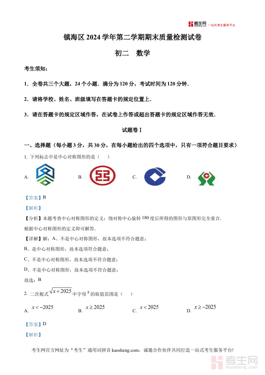 《精品解析:浙江省宁波市镇海区2024-2025学年八年级下学期期末数学试卷(解析版)》是针对浙江省宁波市镇海区2024-2025学年八年级下学期期末数学考试的专项备考资料,精准对应该地区该学段数学学科的期末测评场景,为使用者提供适配性强的学习辅助资源。