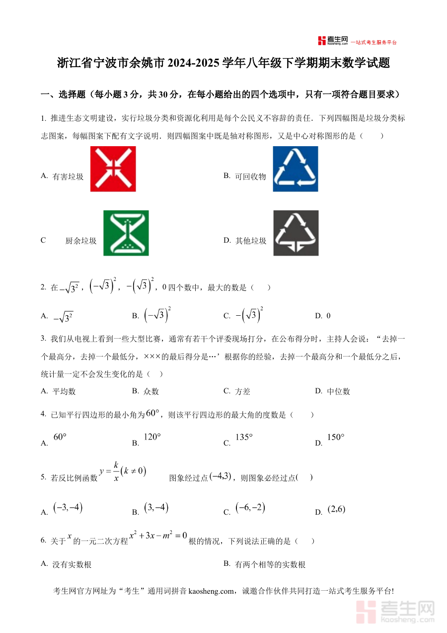 《精品解析:浙江省宁波市余姚市2024-2025学年八年级下学期期末数学试题(原卷版)》是针对浙江省宁波市余姚市2024-2025学年八年级下学期期末数学考试的备考资料,精准匹配该地区该学年八年级下学期的期末数学考试场景,为相关学习与教学活动提供贴合本地教学进度及考试要求的参考载体。