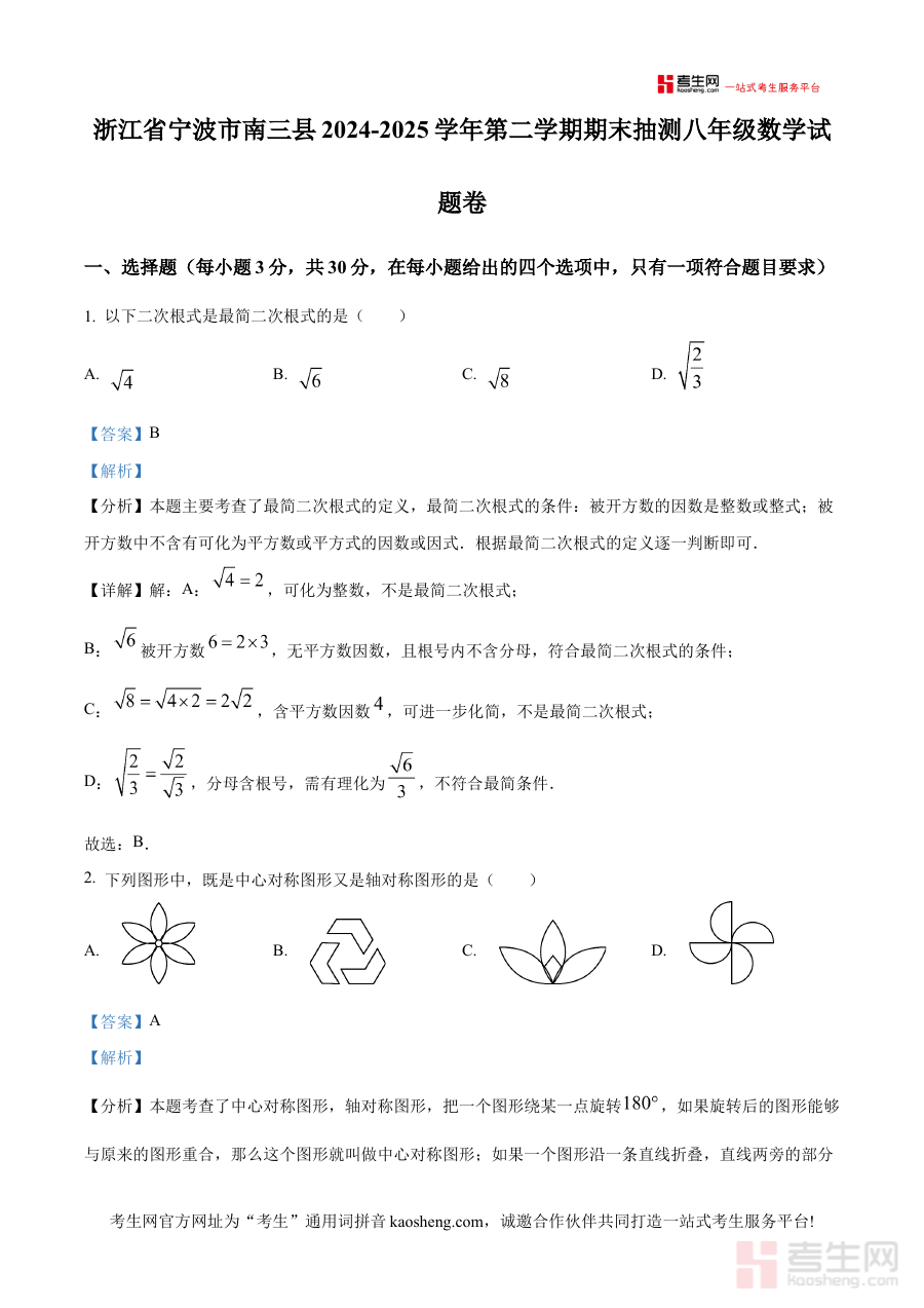 《精品解析:浙江省宁波市南三县2024-2025学年下学期期末抽测八年级数学试题卷(解析版)》是面向浙江省宁波市南三县区域、对应2024至2025学年下学期八年级数学学科期末抽测的专业备考资料,精准对接该地区该学年段数学期末抽测的考查目标与范围,为使用者提供贴合本地教学实际与考试要求的试题解析服务。