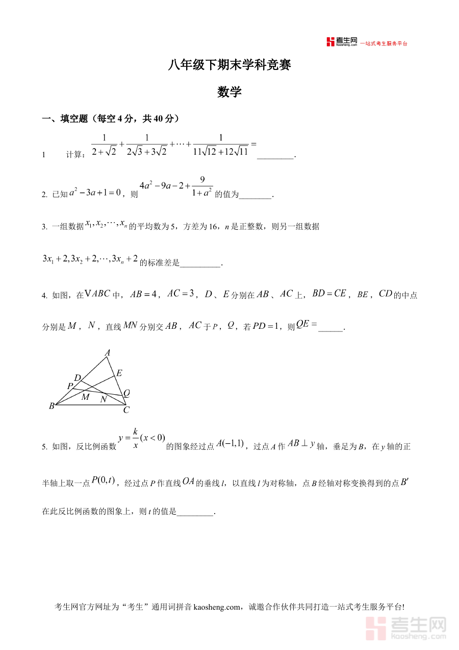 本资料主要适用于浙江省宁波市宋诏桥初级中学2022-2023学年八年级下学期的学生,也可供该阶段数学教师参考;通过阶段检测与备考规划的结合使用,能提升学生对数学竞赛内容的熟悉度,助力其在竞赛中展现良好水平。