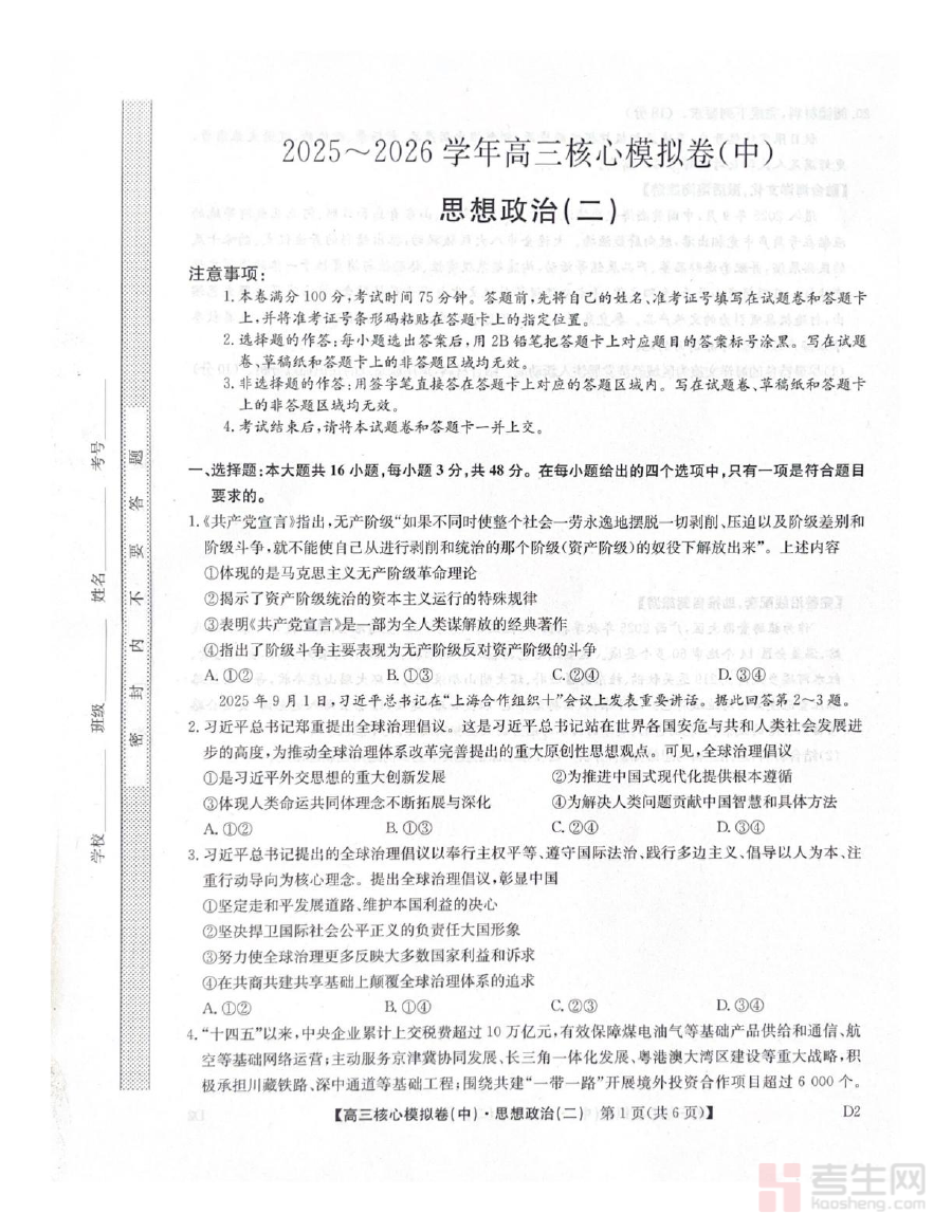 《2025-2026学年上学期高三期末考试政治试题》是针对2025至2026学年第一学期高三年级政治学科期末考试设计的专用备考资料,明确了考试的时间范围、学段、学科及考试性质,为高三政治教学与学习活动提供了清晰的阶段性评估指向,是连接日常教学与期末总结的重要载体,能够帮助相关主体准确把握该阶段政治学科的学习目标与评估标准。