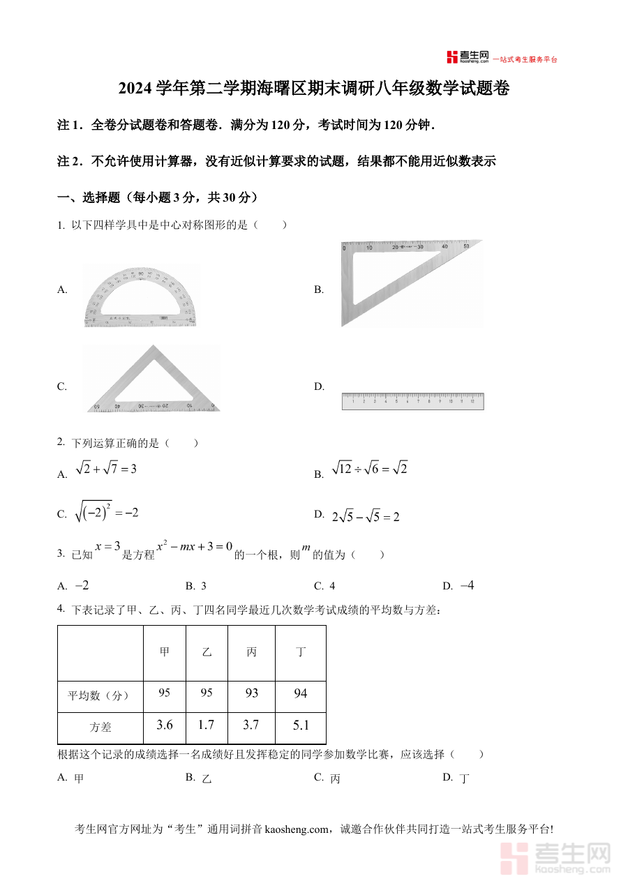 《精品解析:浙江省宁波市海曙区2024-2025学年八年级下学期期末数学试卷(原卷版)》是针对浙江省宁波市海曙区特定学年与学段的数学期末考试资料,其年份范围为2024至2025学年,对应的是八年级下学期的期末阶段数学考试。作为原卷版资料,它完整呈现了该区域期末数学考试的试卷原貌,为相关使用者提供了直接接触本地期末考真实内容框架的途径,是备考该考试不可或缺的基础参考资料之一。