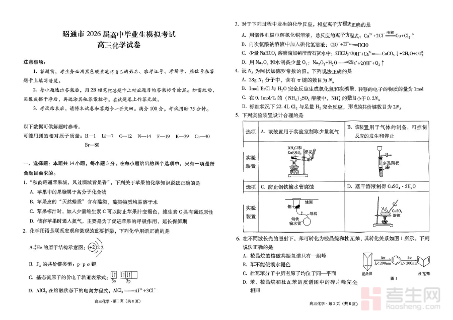 该资料的适用人群为云南省昭通市2026届高中毕业生及从事高三化学教学的教师。对于学生而言,它可作为自我评估的工具,明确自身化学知识体系中的薄弱环节并进行针对性强化;对于教师来说,它能为教学效果评估提供客观依据,辅助优化备考规划与教学方案。通过使用该模拟考试资料,师生双方可协同推进备考进程,提高复习效率与质量,为最终的高考化学科目取得理想成绩做好充分准备。
