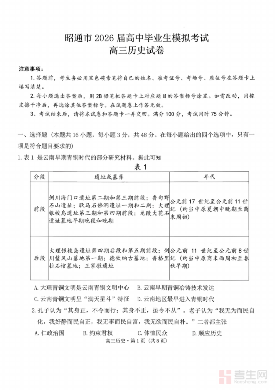 此资料的适用人群为云南省昭通市2026届高中毕业生及承担该届历史教学任务的教师。对于毕业生而言,它是高考历史备考过程中的重要辅助工具,能帮助其适应本地考试的命题风格与难度设置,提升应试信心与能力;对于教师而言,则可借助该资料开展高效的教学评估与训练指导,助力学生在高考历史科目中取得理想成绩。