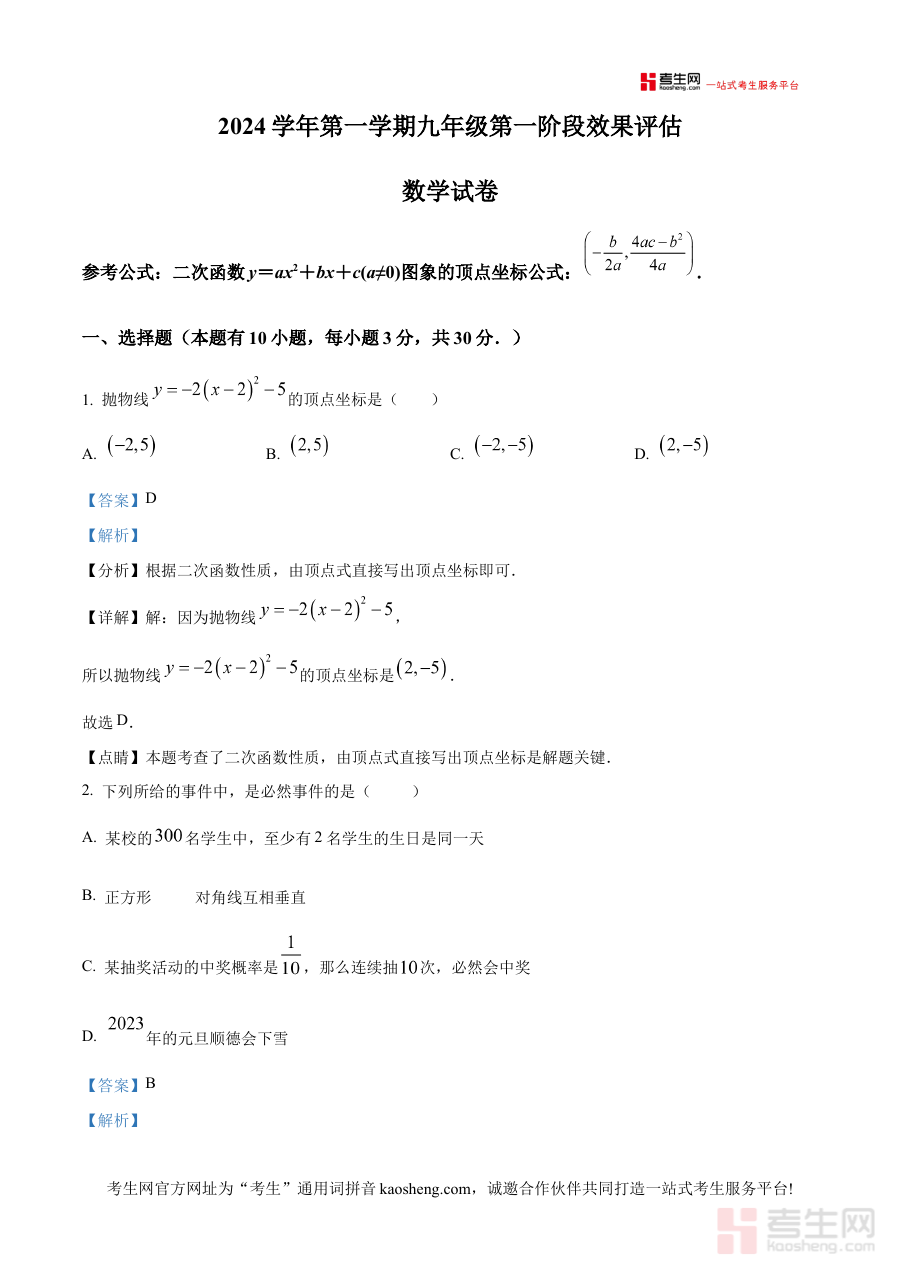 《精品解析:浙江省宁波市余姚市六校第一次联考2024-2025学年九年级上学期数学试题卷(解析版)》是针对2024-2025学年浙江省宁波市余姚市六所学校联合组织的九年级上学期第一次数学阶段性联考所编制的专业解析类备考资料。该资料紧密结合本次区域联考的命题背景与考查目标,为使用者呈现了符合当地教学进度与考试要求的系统解析内容,能够有效反映该阶段数学学习的区域考查方向与重点。