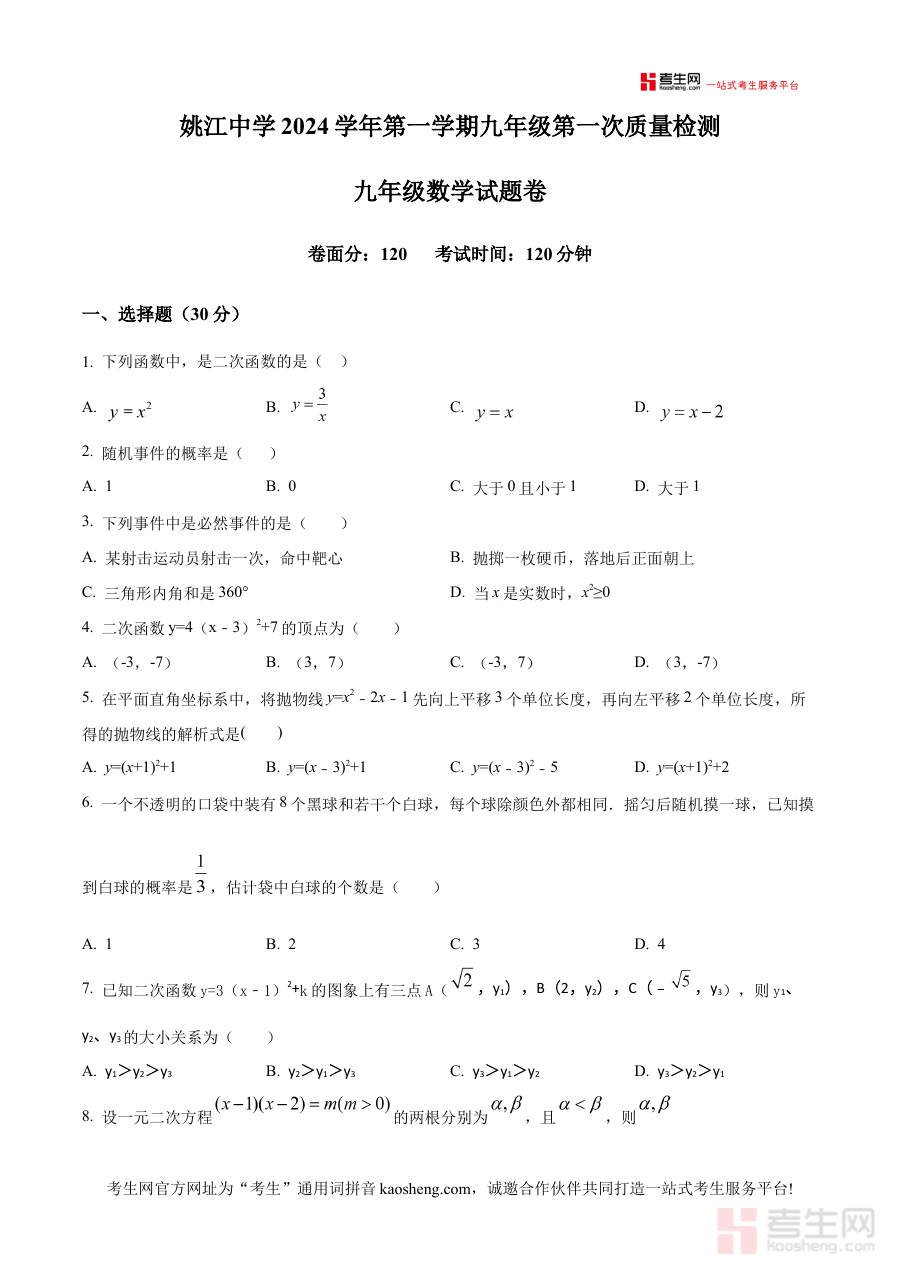 《精品解析:浙江省宁波市余姚市姚江中学2024—2025学年九年级上学期10月月考数学试卷(原卷版)》是针对浙江省宁波市余姚市姚江中学2024至2025学年九年级上学期10月数学月考编制的备考资料,精准对应该阶段的考试安排与学习进度,为相关群体提供贴合本地校考实际的复习参考依据。