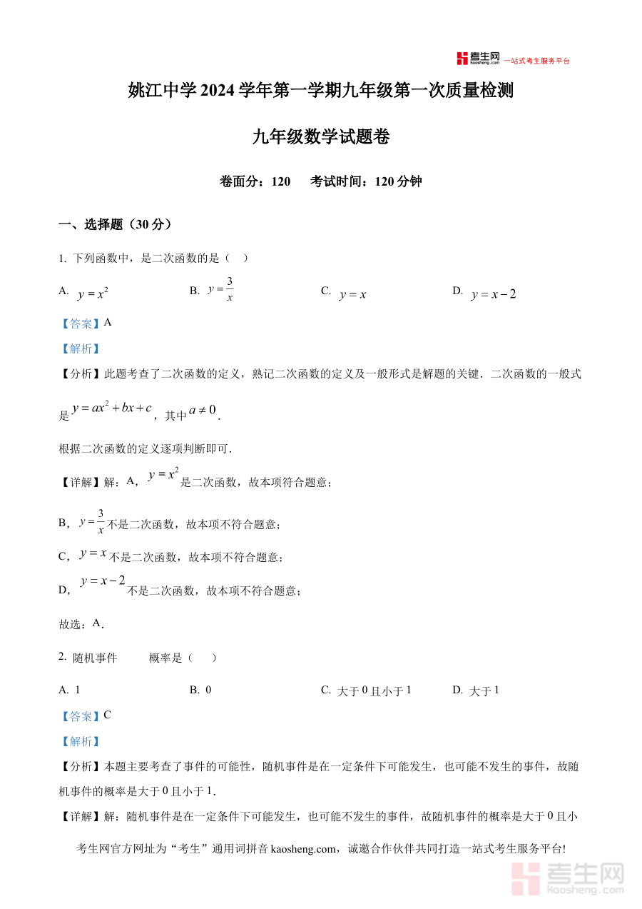《精品解析:浙江省宁波市余姚市姚江中学2024—2025学年九年级上学期10月月考数学试卷(解析版)》是针对浙江省宁波市余姚市姚江中学特定学年与学段的数学月考备考资料。其核心定位是服务于该校2024至2025学年九年级学生上学期10月的数学月考准备,依托本校当次月考的试卷内容及专业解析,为学生提供与本校教学进度和考试要求高度匹配的学习支持。