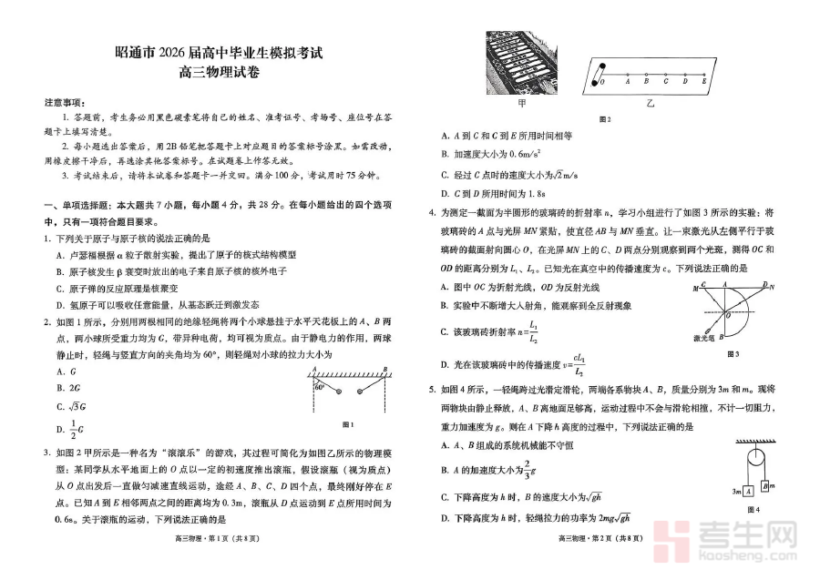 此资料的适用人群主要为云南省昭通市2026届高中毕业生以及从事该届毕业生物理教学工作的教师。对于毕业生来说,它不仅能帮助其熟悉考试的时间安排、题型分布等形式要素,还能通过练习检验自身对物理知识的综合运用能力;对于教师而言,可借助该资料的检测结果调整教学策略,优化教学内容,更好地指导学生进行高效备考,共同为提升升学成绩奠定坚实基础。