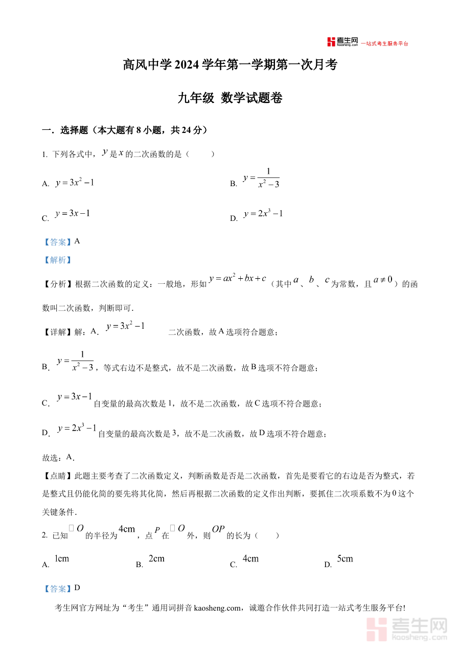 《精品解析:浙江省宁波市余姚市高风中学2024—2025学年九年级上学期10月月考数学试卷(解析版)》是针对浙江省宁波市余姚市高风中学2024-2025学年九年级上学期10月数学月考的专业备考资料,明确了考试的时间节点、学校范围及学科类型,为相关师生提供对应阶段的数学学习参考依据,帮助使用者快速把握该次月考的核心定位与考查背景。