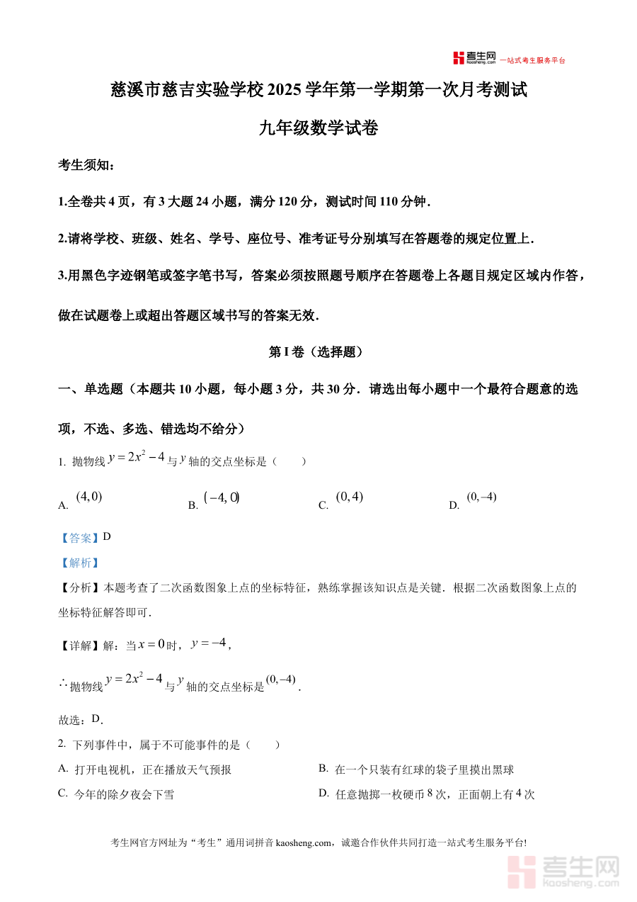 《精品解析:浙江省宁波市慈溪市慈吉实验学校2025-2026学年九年级上学期9月月考数学试题(解析版)》是针对浙江省宁波市慈溪市慈吉实验学校特定学年学期与考试节点的数学备考资料,精准对应该校2025-2026学年九年级上学期9月的数学月考,能够为使用者提供与该次考试直接相关的系统性参考内容,帮助把握考试的整体定位与核心方向。