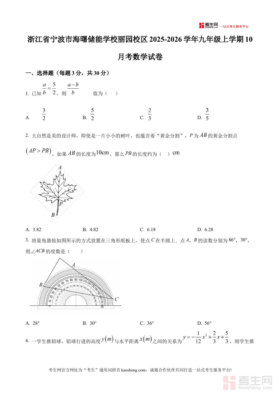 《精品解析:浙江省宁波市海曙储能学校丽园校区2025-2026学年九年级上学期10月考数学试卷(原卷版)》是针对浙江省宁波市海曙储能学校丽园校区2025-2026学年九年级上学期10月数学考试的配套备考资料,明确对应特定学年、学期及阶段的数学学科考试场景,为相关使用者提供贴合该校区教学进度与考试要求的参考载体。