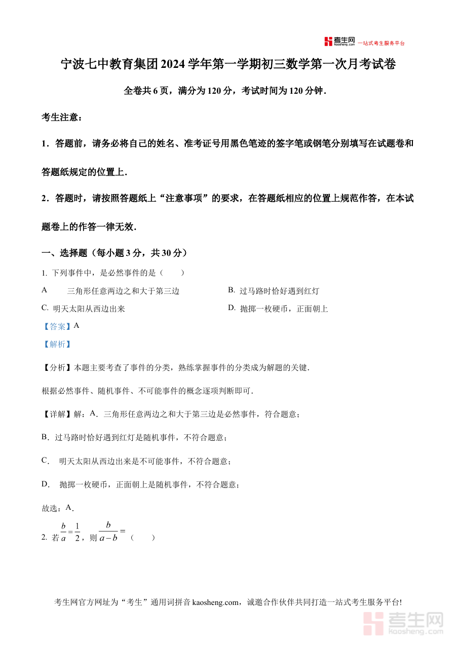 《精品解析:浙江省宁波市第七中学2024-2025学年九年级上学期第一次月考(期中)数学试卷(解析版)》是针对浙江省宁波市第七中学2024-2025学年九年级上学期第一次月考(期中)数学考试的专业备考资料,聚焦该阶段数学学科的考试内容,提供了全面且详细的解析内容,为参与本次考试的学生及授课教师提供了直接对应的参考资源,有助于师生快速获取与本次考试相关的专业指导。
