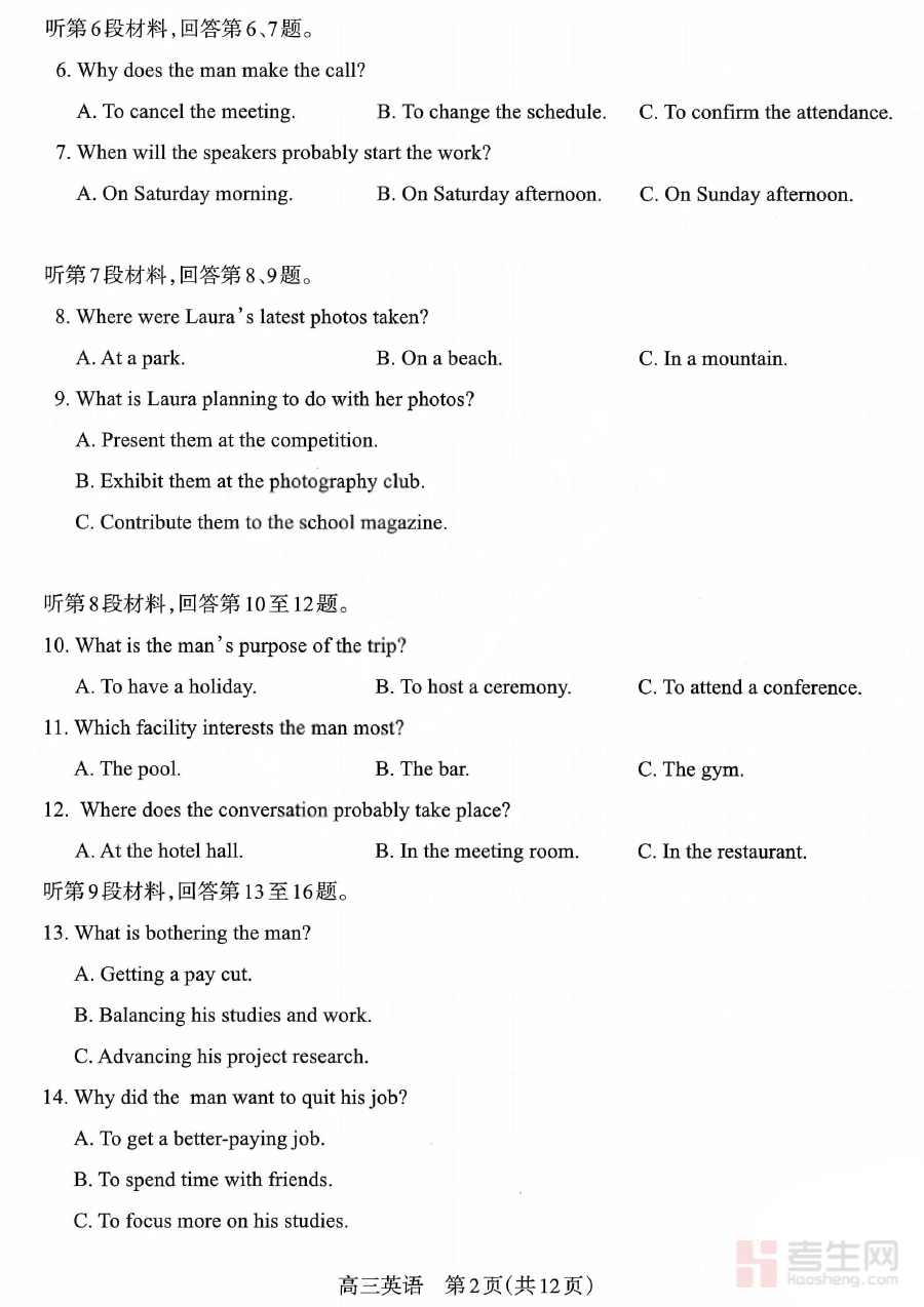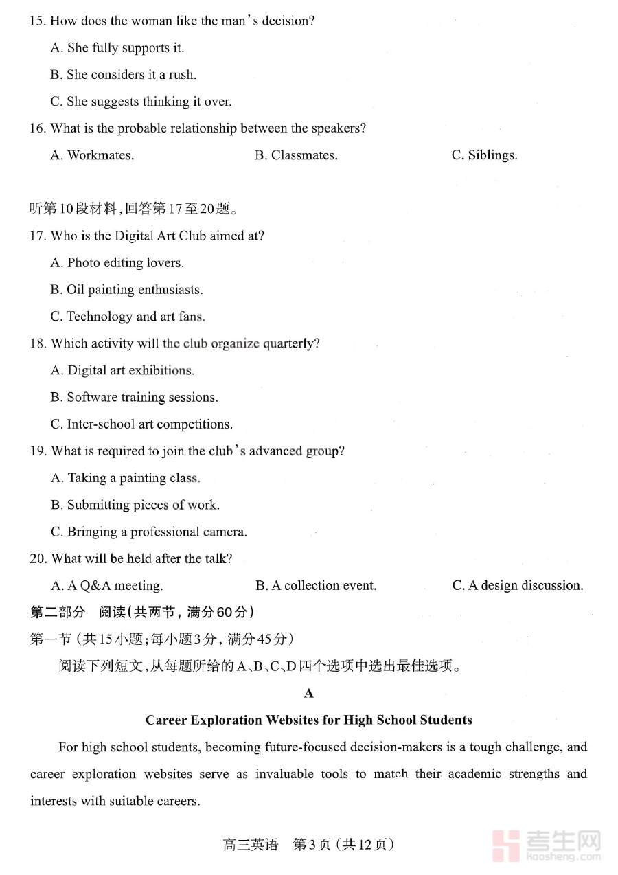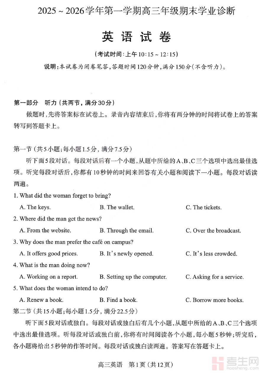 该试卷的适用人群主要为太原市25-26学年的高三在读学生以及从事高三英语教学的一线教师。对于学生来说,使用该试卷进行自我检测或模拟练习,能够帮助他们熟悉期末考的考查方向与节奏,及时调整学习策略;对于教师而言,则可利用该试卷开展阶段性教学效果评估,优化教学内容与方法,助力师生共同提升备考效率与学习质量。