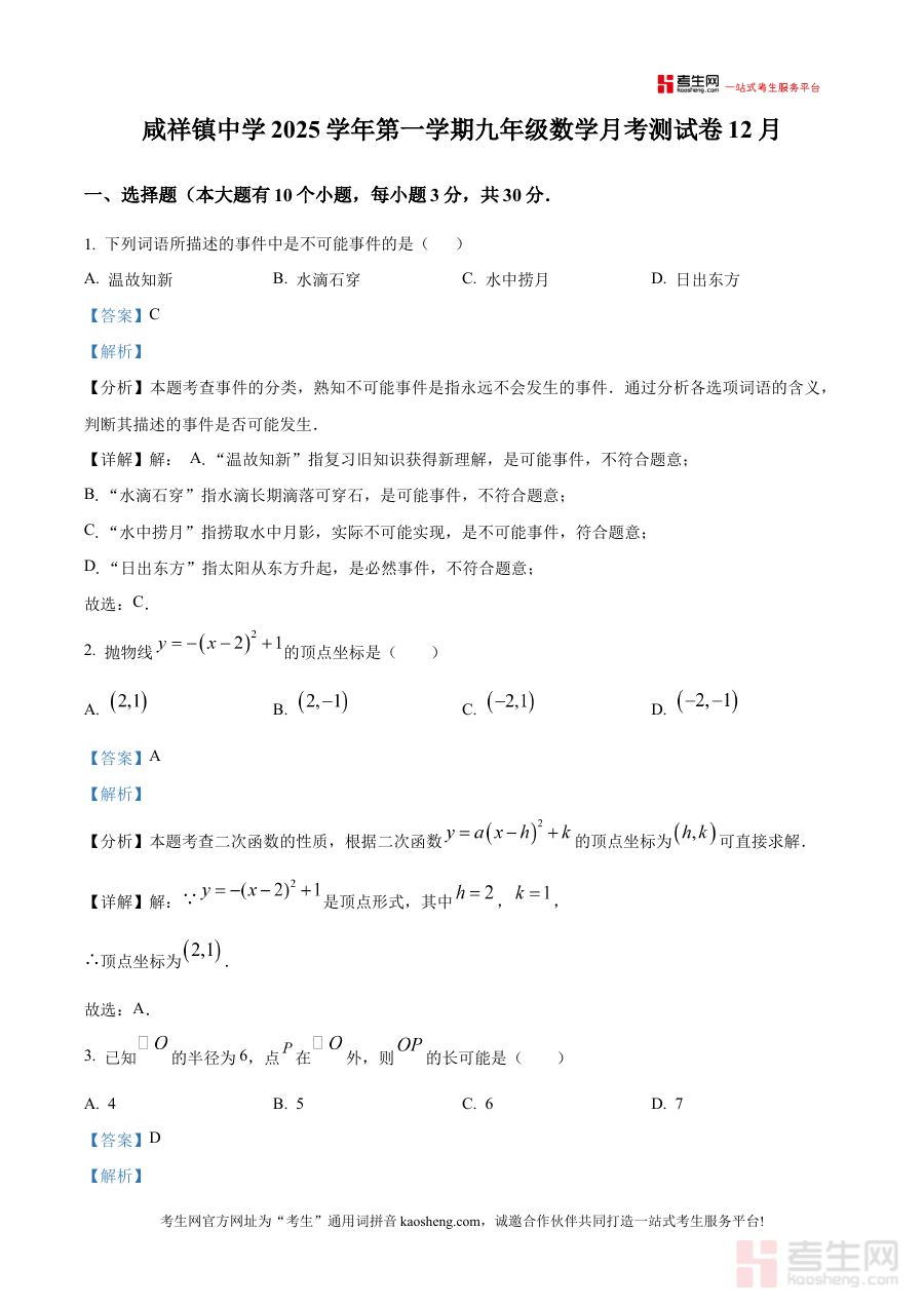 《精品解析:浙江省宁波市鄞州区咸祥镇中心初级中学2025-2026学年九年级上学期12月月考数学试题(解析版)》是针对浙江省宁波市鄞州区咸祥镇中心初级中学2025-2026学年九年级上学期12月月考数学科目的备考资料,结合该阶段教学进度与考试要求,为相关使用者提供具有针对性的解析内容。