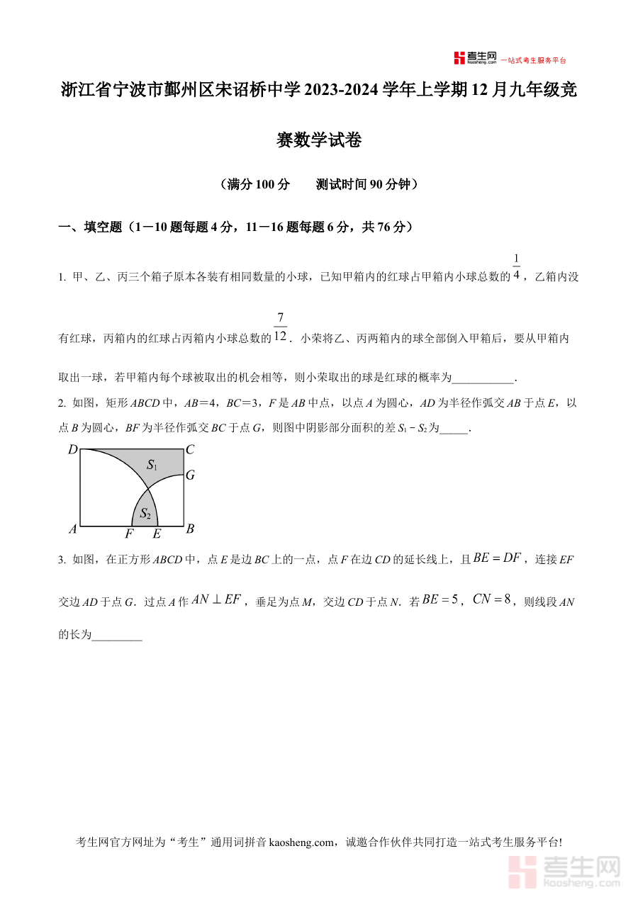 《精品解析:浙江省宁波市鄞州区宋诏桥中学2023-2024学年上学期12月九年级竞赛数学试卷(原卷版)》是针对浙江省宁波市鄞州区宋诏桥中学2023至2024学年第一学期12月举行的九年级数学竞赛所编制的原卷版备考资料。该资料精准对应特定学校在特定学年段的竞赛考试场景,能够为使用者提供与实际竞赛考试形式高度一致的内容呈现,帮助使用者提前熟悉考试的整体框架与组织形式,确保备考方向与实际考试需求相契合。