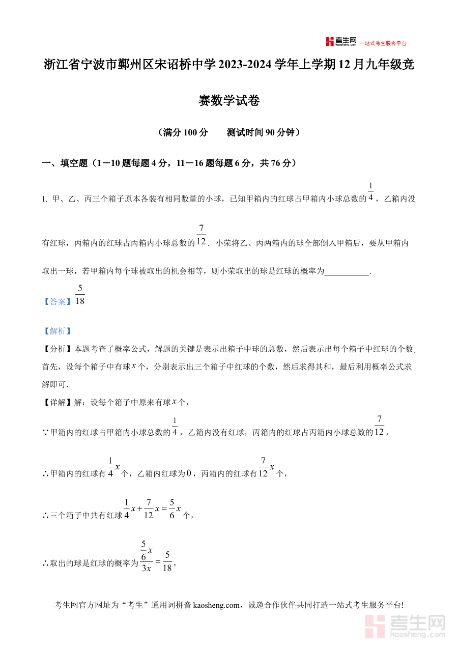 《精品解析:浙江省宁波市鄞州区宋诏桥中学2023-2024学年上学期12月九年级竞赛数学试卷(解析版)》是一份针对特定场景的数学竞赛备考资料,对应浙江省宁波市鄞州区宋诏桥中学在2023-2024学年上学期12月开展的九年级数学竞赛,解析版的形式为使用者提供了专业的解题指导与思路梳理,精准匹配该阶段竞赛的时间节点与地域特性,是贴合竞赛需求的优质学习资源。