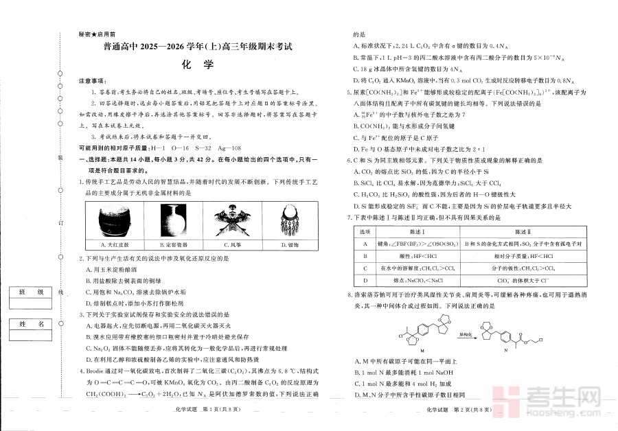 作为高三化学学习的阶段性工具,该试卷可用于学情诊断与备考规划辅助。教师可通过试卷的测试结果,系统了解学生在化学学科上的阶段性掌握情况,精准定位班级整体或个体的知识薄弱环节;学生则能借助试卷完成自我检测,清晰认识自身在化学学习中的优势与不足,为后续的复习重点调整和学习策略优化提供数据支撑,助力备考方向更具针对性。