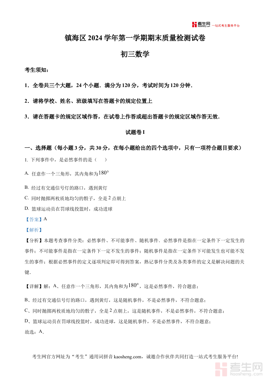 《精品解析:浙江省宁波市镇海区2024-2025学年九年级上学期1月期末考试数学试卷(解析版)》是聚焦浙江省宁波市镇海区特定学段与时间节点的数学学科备考资料,精准对应2024-2025学年九年级上学期1月份的期末考试场景,覆盖了该学段上学期的核心学习阶段,为本地九年级学生及教育工作者提供了与区域考试直接关联的解析资源,有效匹配了本地教育教学的阶段性需求与考试导向。